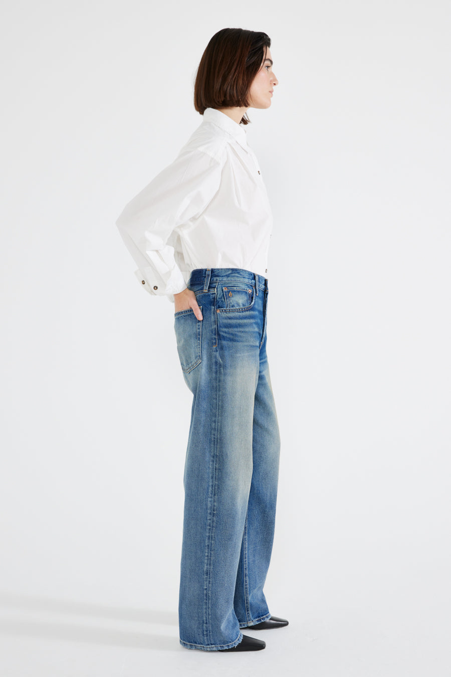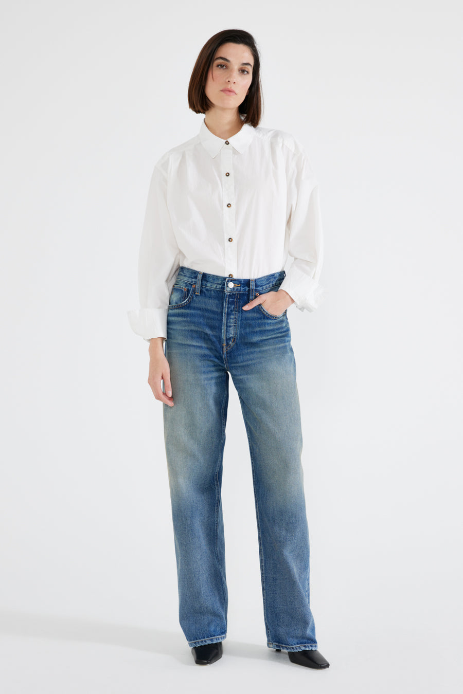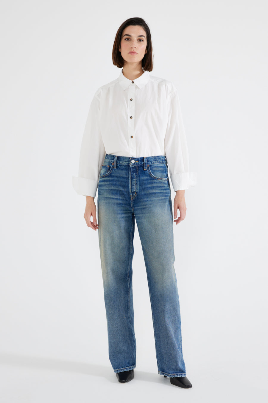 A modern relaxed fit with a button fly and a straight waistband that sits comfortably on the hip. A high contrast fashion wash completes the look.