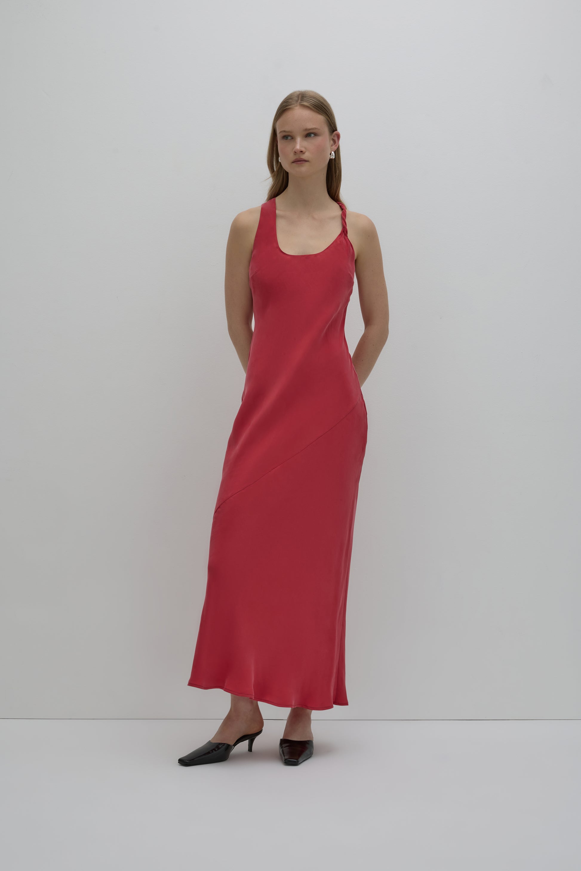The Amaya Cupro Dress is made in our signature premium cupro fabrication that has a soft, sueded hand feel. The silhouette is maxi length and cut on the bias. Features include a scoop neckline, strap with twist detail and asymmetric seam through skirt.