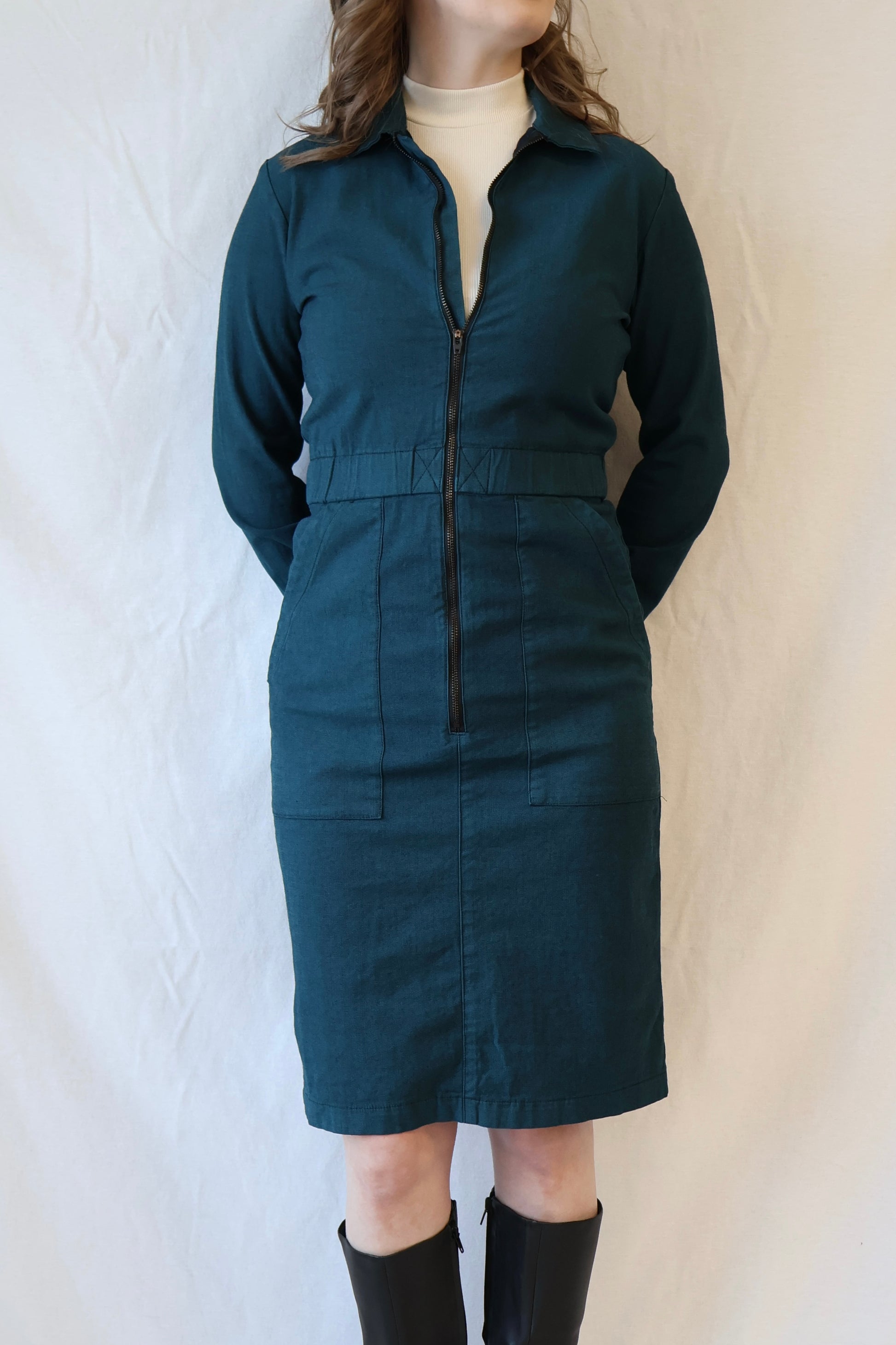 Your favorite coveralls, all dressed up. The Boiler Dress is a bold, utilitarian take on everyday dressing—designed to get things done in style. Featuring a zip front, soft elastic waist, and oversized patch pockets, it balances structure with ease for a fit that works as hard as you do. Inspired by women who lead with their hands and hearts, this is your winter uniform: functional, fearless, and unapologetically you.