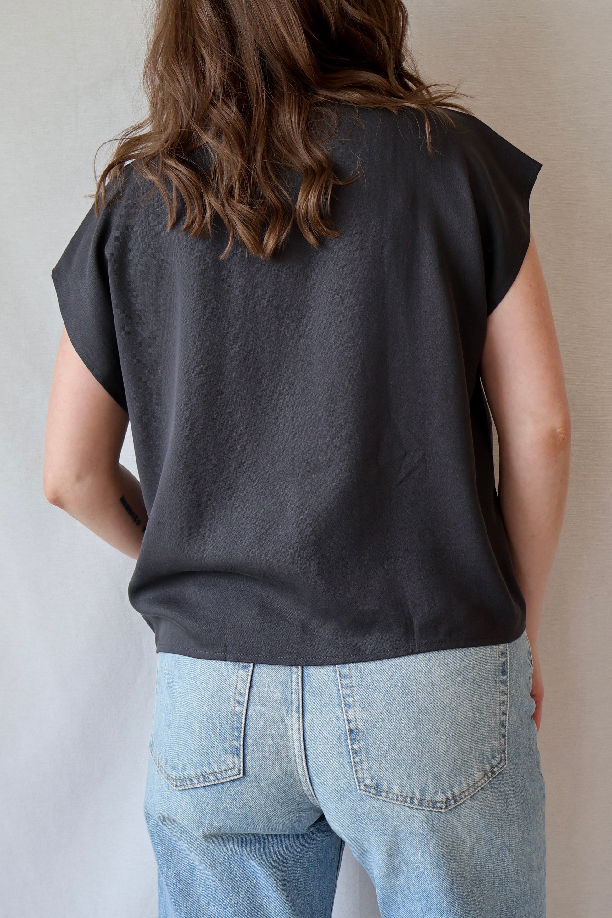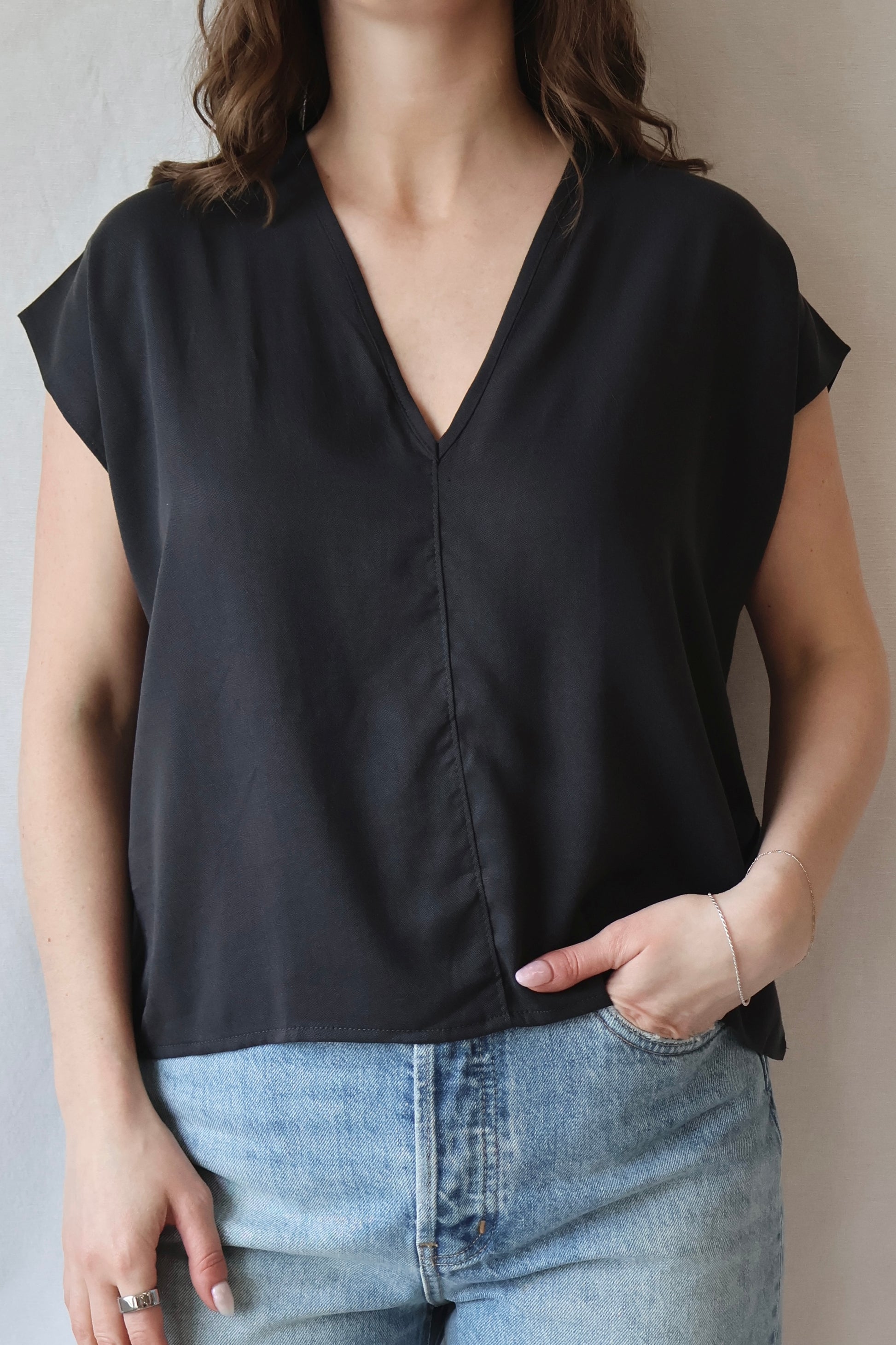 A tried & true core favorite in tencel viscose. Simple elegant top with a boxy silhouette. V-neck line with topstitch detail at the center front. Slightly cropped fit.