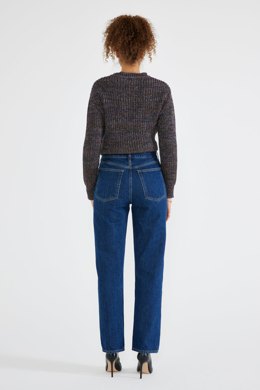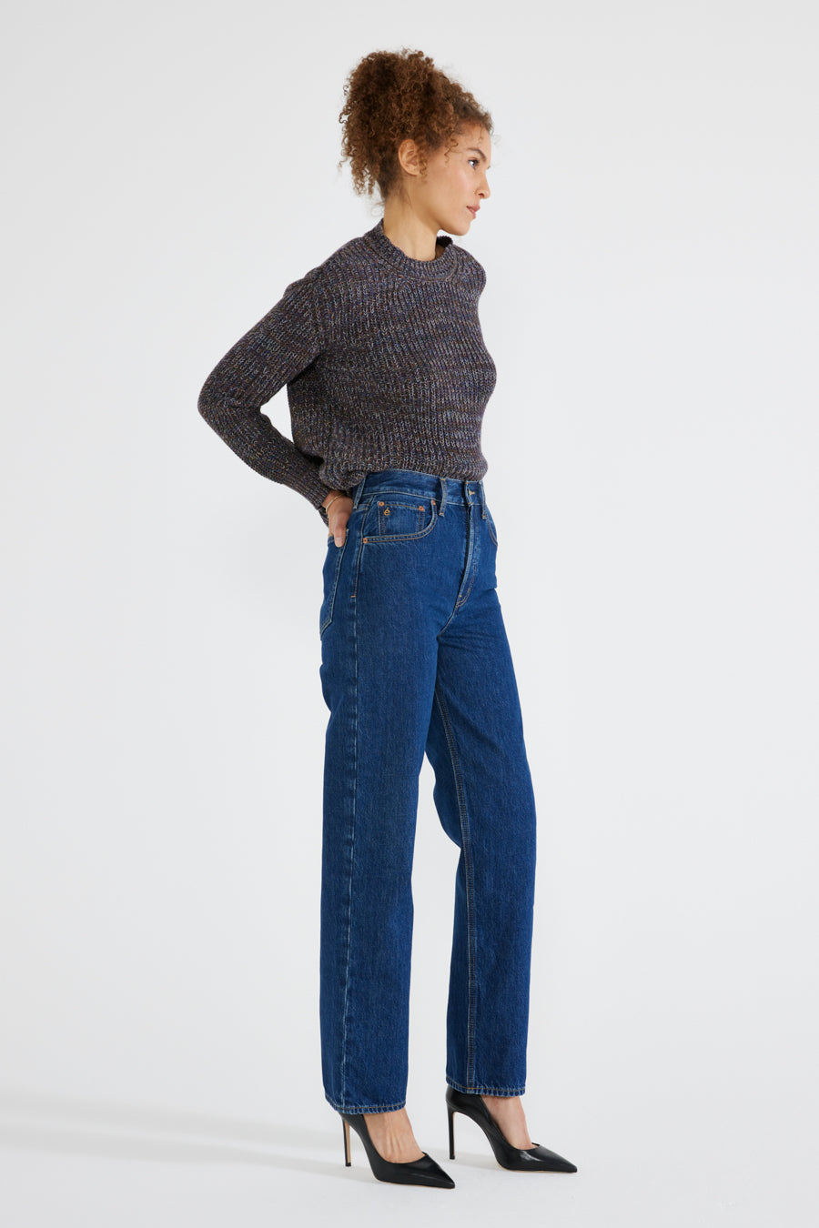 A 90's-inspired straight that sits at the natural waist with a relaxed fit through the hip and leg, ending in a slight stack at the ankle. A clean dark wash on an organic cotton denim adds to the vintage appeal.