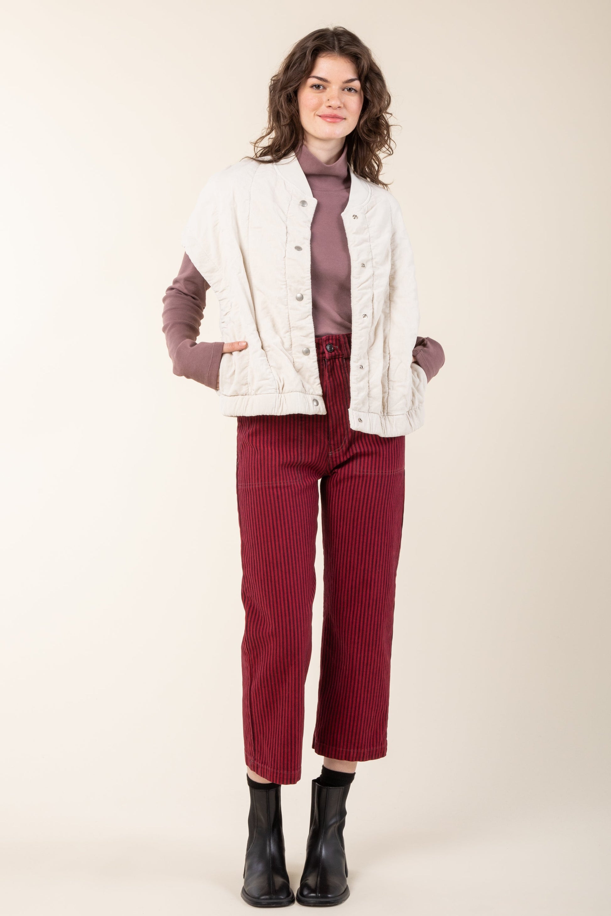 A fleece vest that was created the Prairie way, a stubborn square shape with cotton quilting throughout, and a soft shawl collar. A fine whale cotton corduroy adds even more texture and the lightly tensed elastic at the hem finishes the silhouette in a graceful way. Snap closure and side seam pockets that perform double duty as separate interior pockets.
