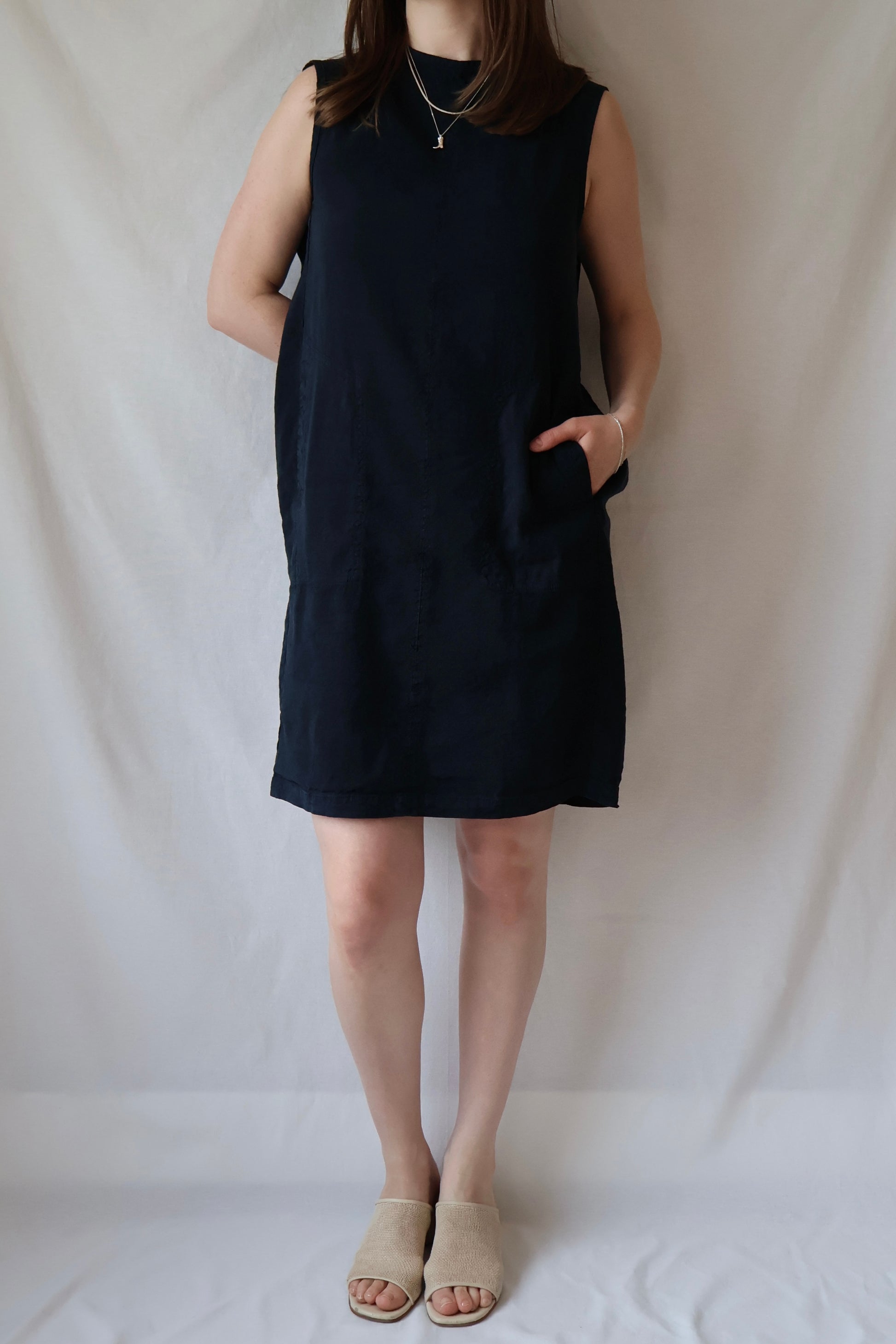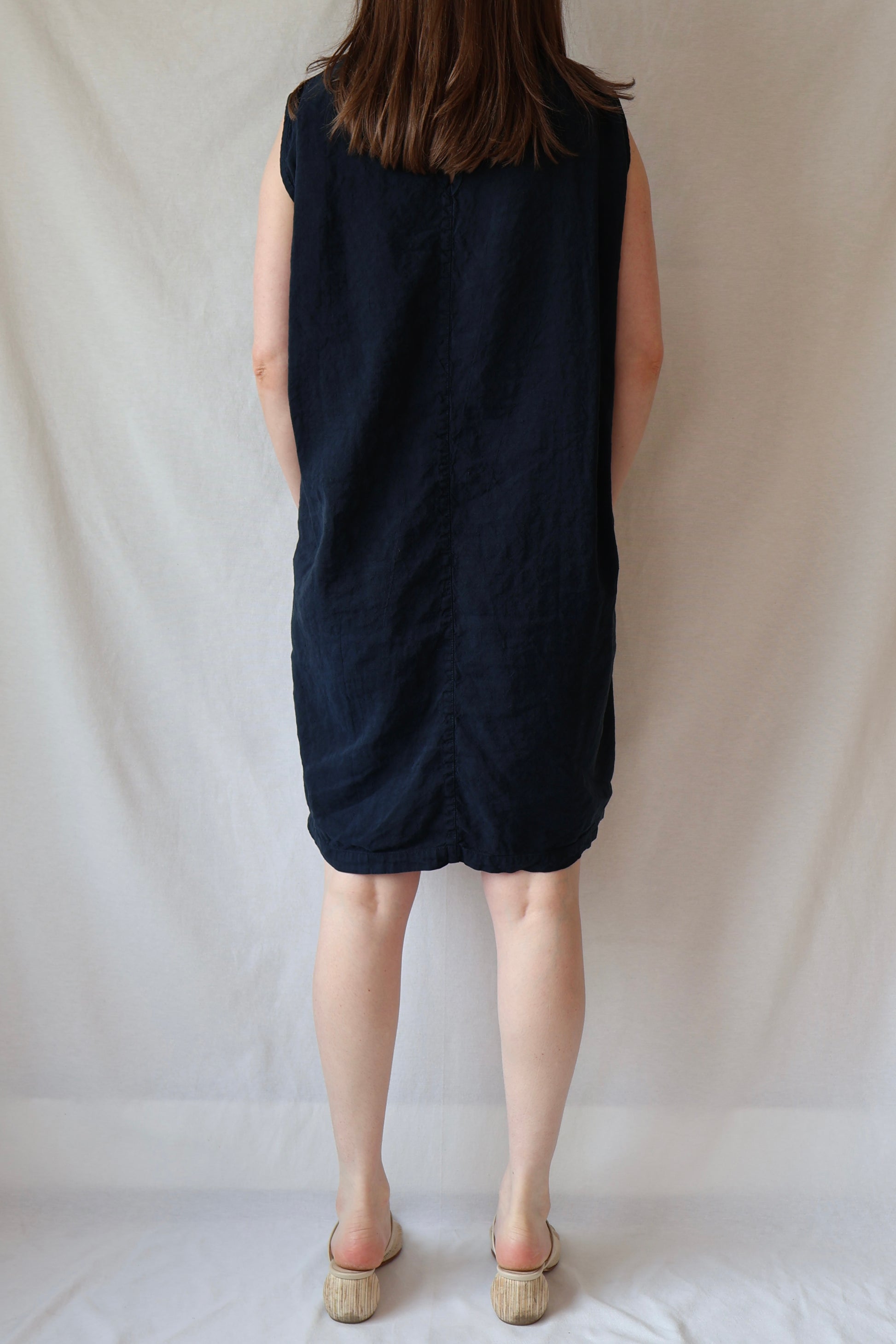 An ovoid shell dress with wide-set armholes and a voluminous back. Reminiscent of the architectural shaping of the 60s in an updated textile. Our favorite mid-weight hemp/silk blend is easy to care for, packs beautifully (remember to roll), and adds a subtle texture to any ensemble. Loose fitting with a single back button closure.