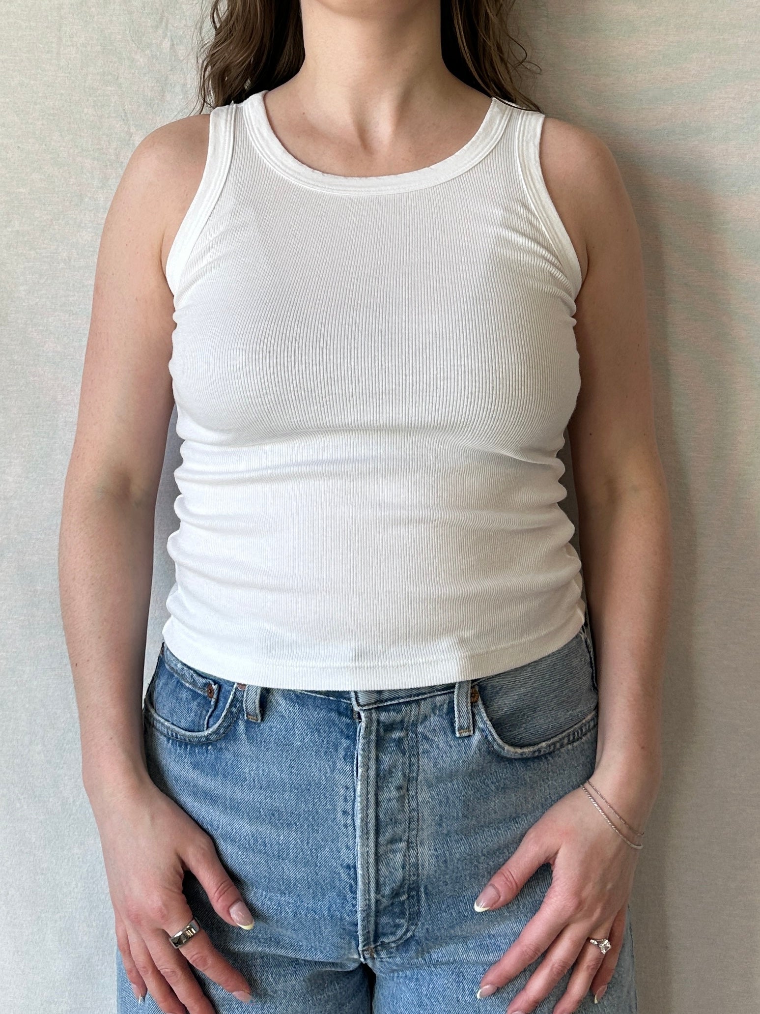 this bra-friendly high-next tank is made from form-fitting luxe rib. it’s a little dressy but can truly be worn for any occasion. versatile and stylish - we say yes.