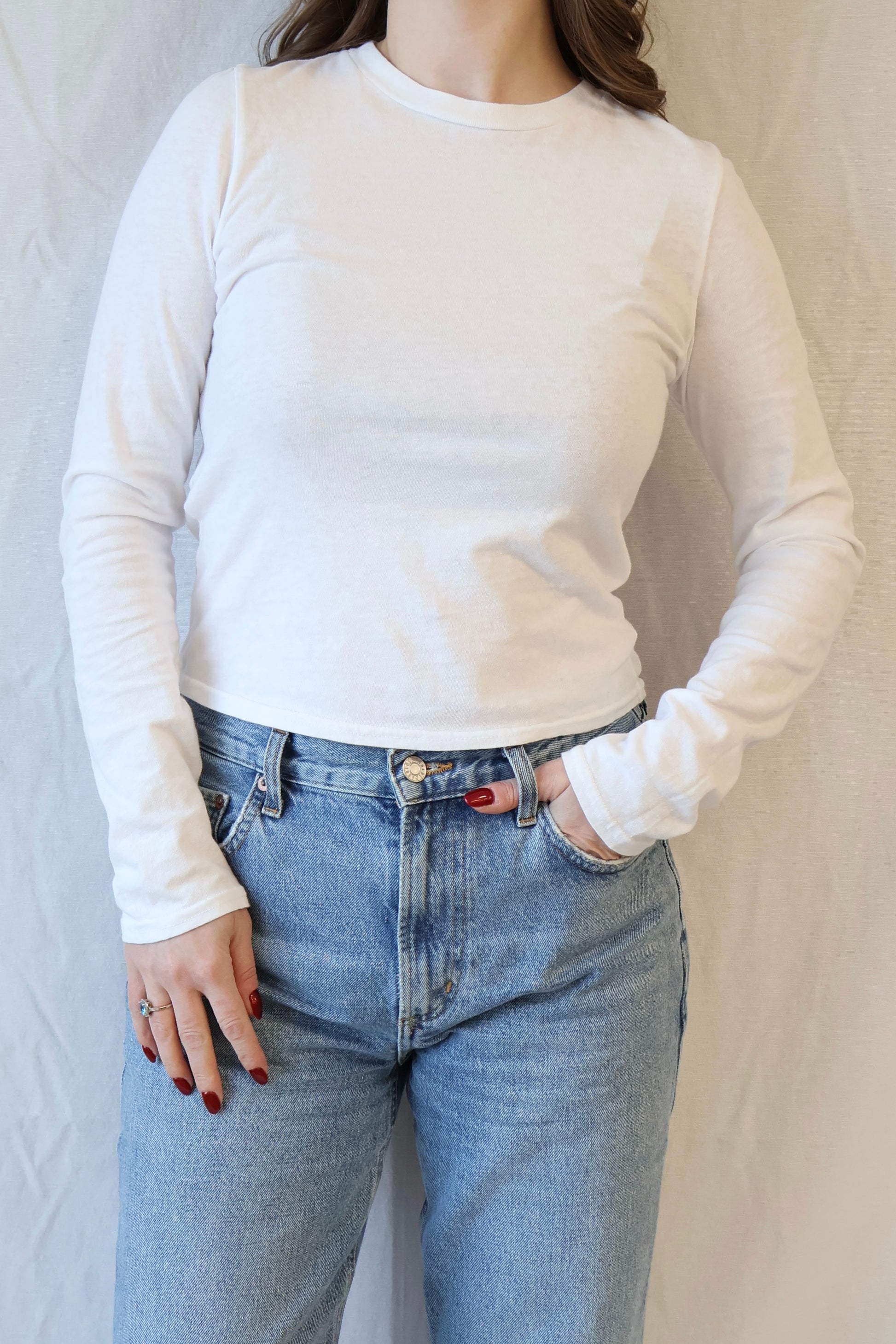 this long-sleeve is made from recycled cotton with a body-skimming fit that hits right at your natural waist. full length, never cropped, and ready to be on heavy rotation.