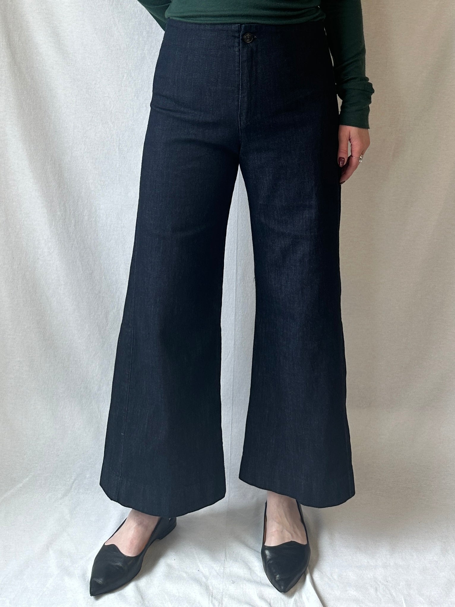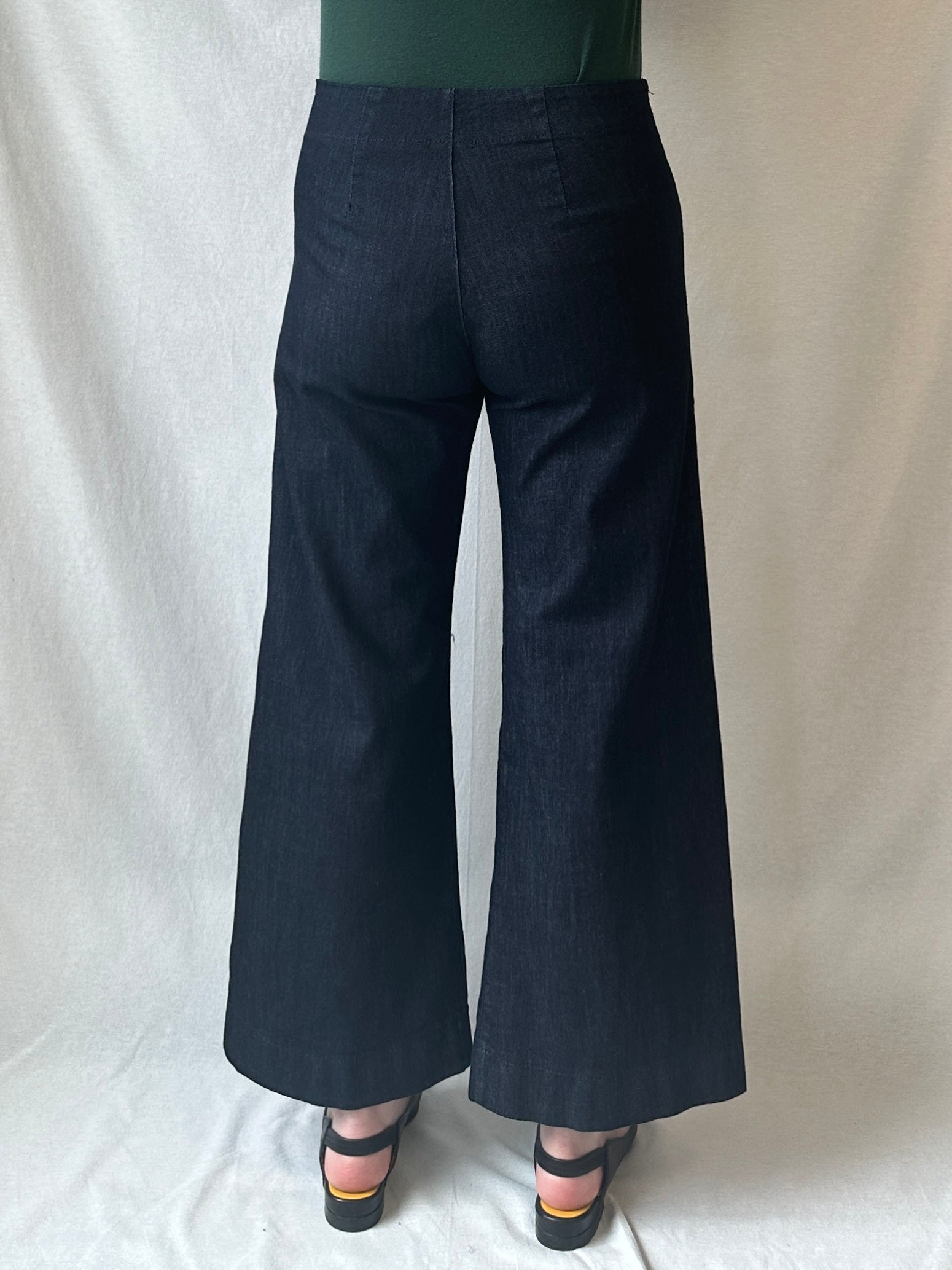 A sleek mid-rise, wide-leg, cropped pant made with high-stretch denim that conforms to your body. Casual and classic, with two back darts for shaping and no pockets for a minimal look that is also ideal for layering. The Knack Pants are pre-shrunk and retain their shape. Some dye transfer may occur before the first two laundry cycles. Wash in cold water to prevent fading.