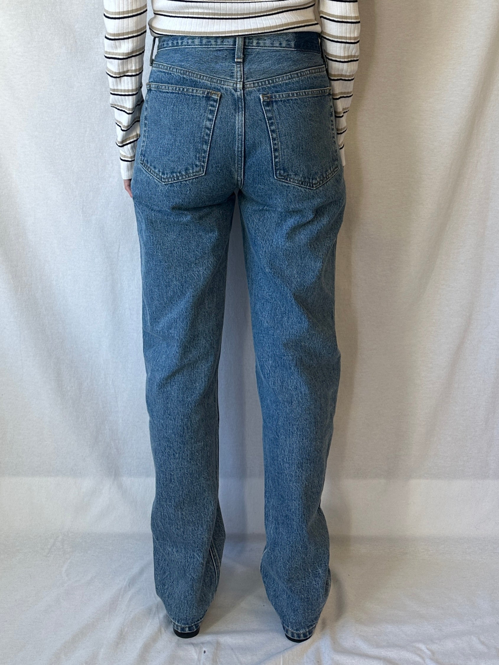 A modern, ultra-high true straight that is fitted through the hips and extends with a sharp, clean leg.