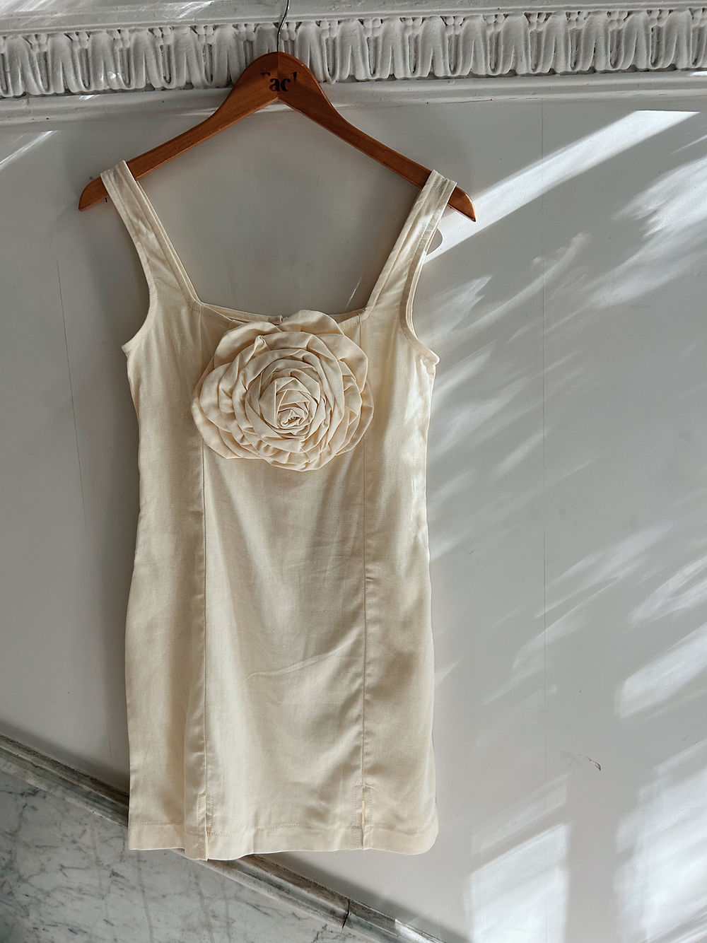 Mini linen dress. Square neckline. Exaggerated flower detail at the centre.