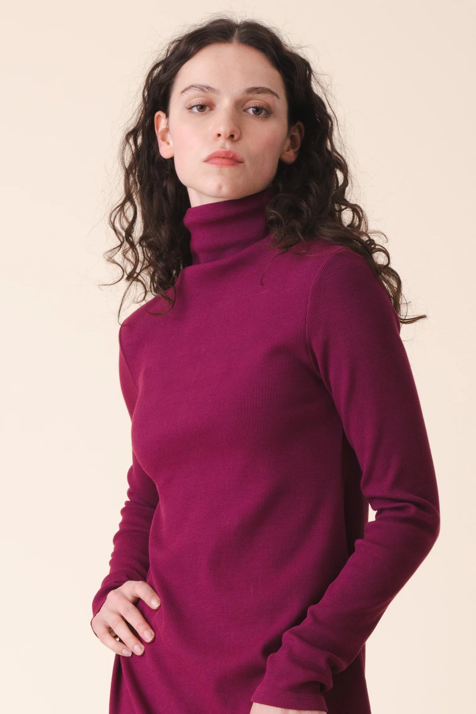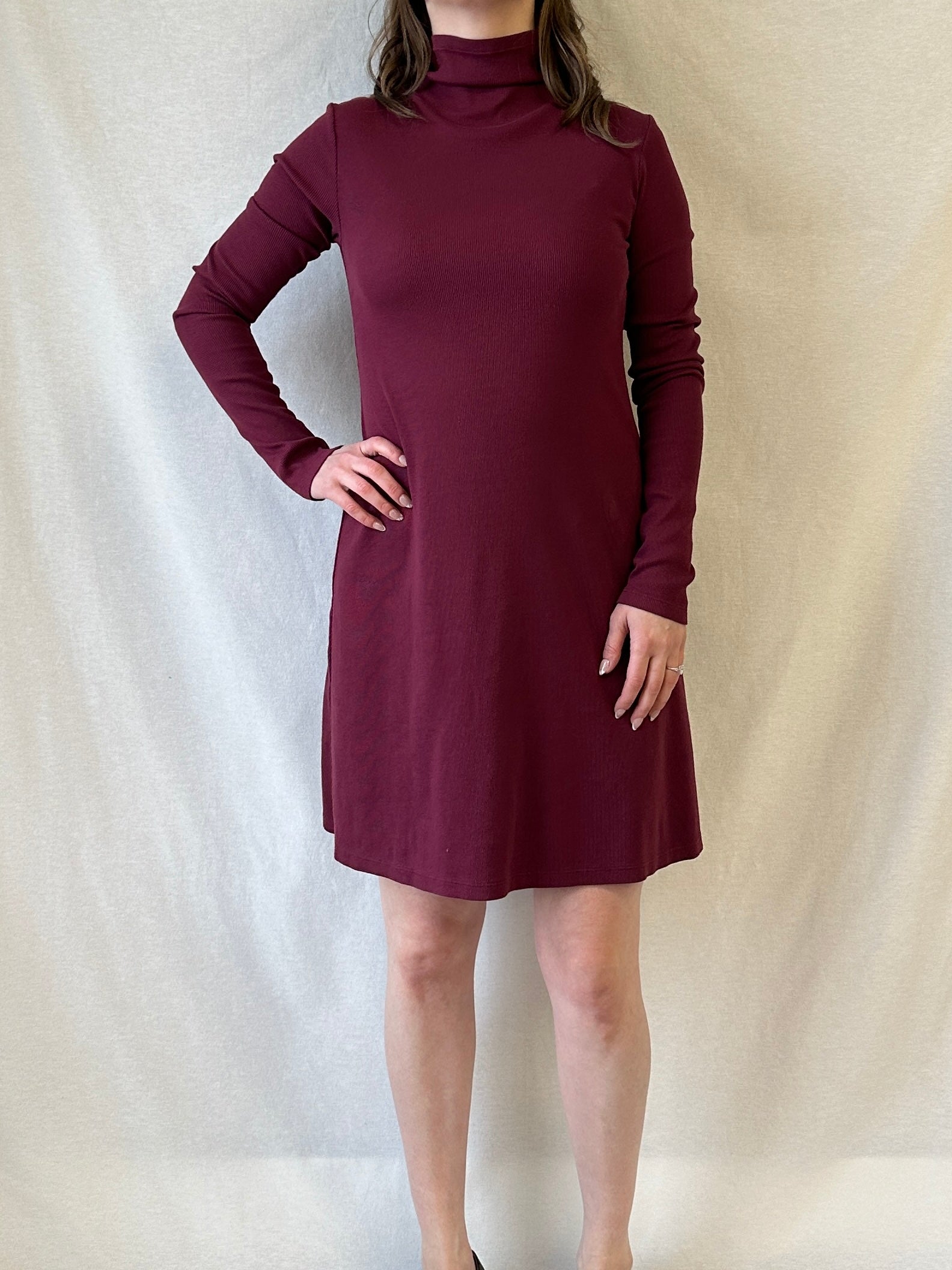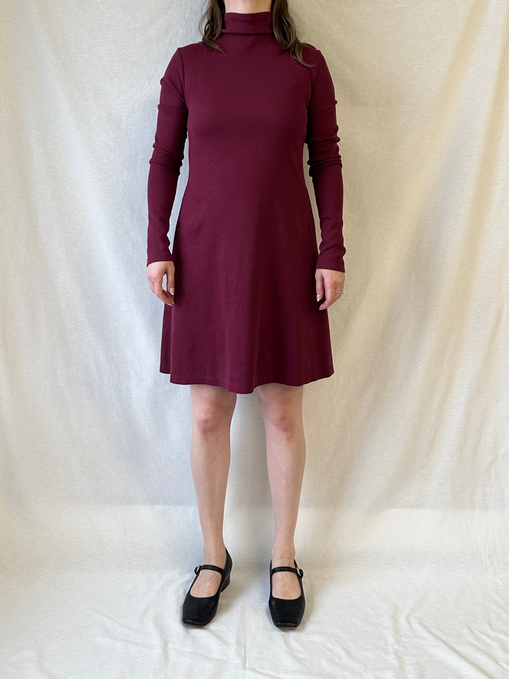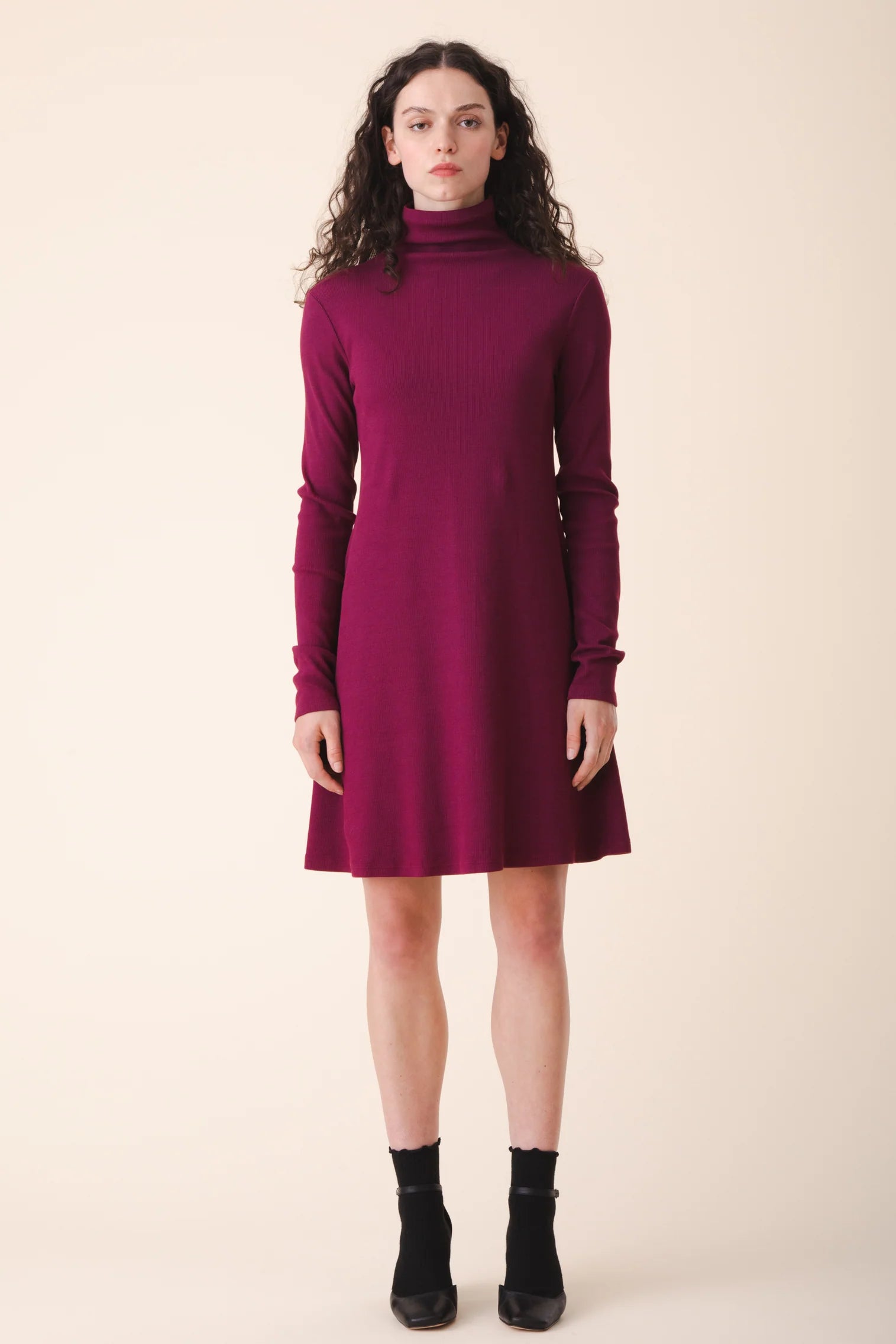 The dress you’ll wear over and over; imperceptibly and beautifully. Magic on everybody, it takes getting dressed out of the way, to focus on the face and gesture. The resilient organic cotton spandex rib takes color deeply and has a matte surface. A simple, chic mock turtleneck dress with generous sleeves and a flattering A-line silhouette. The perfect piece for styling over tights, under a trench, or with your favorite pair of boots.