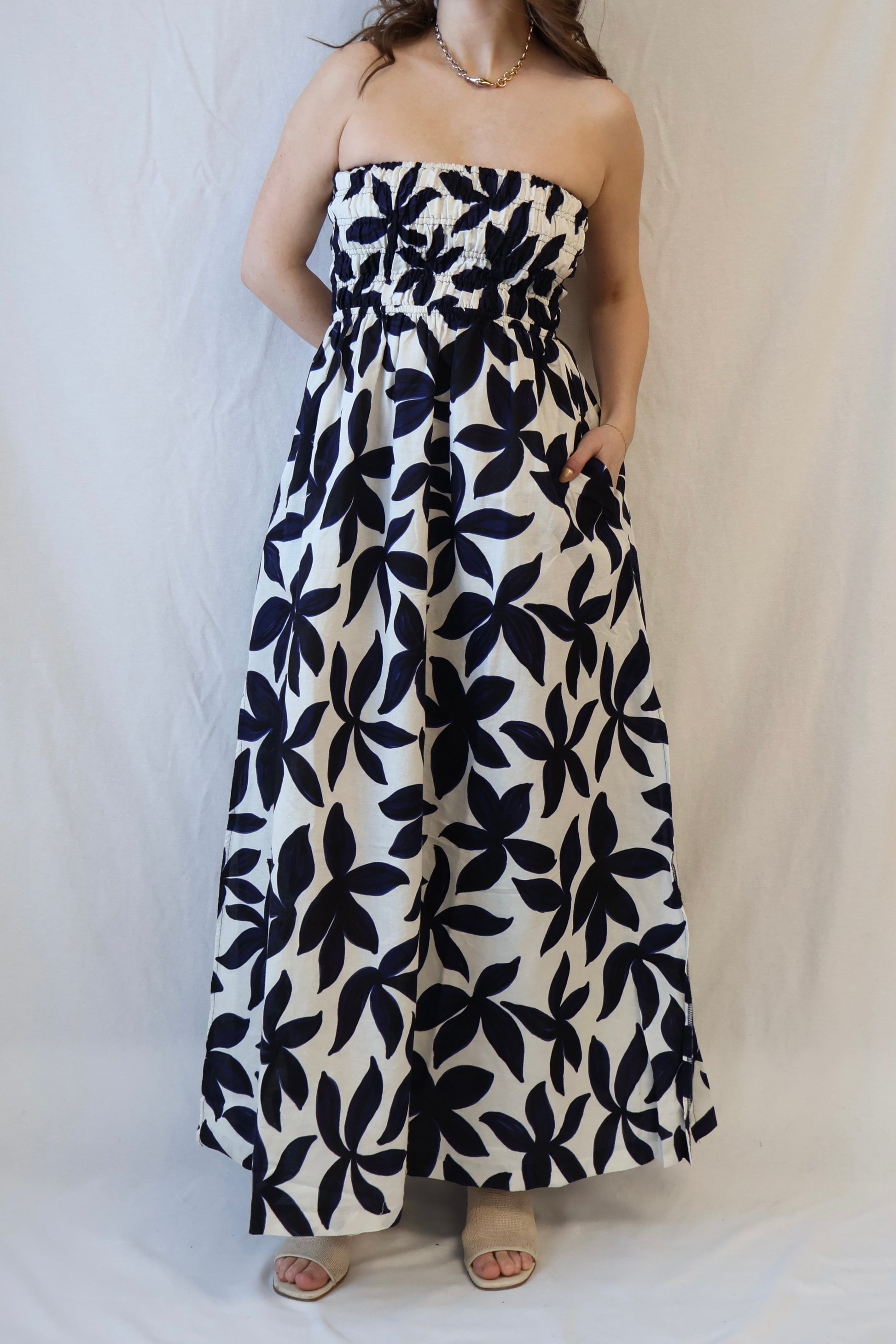 The Odessa Maxi Dress is made from a linen blend fabrication perfect for your warm weather destinations. The shape is in a best selling silhouette which is feminine and relaxed with a strapless, shirred elasticated bodice and soft billowing skirt that finishes above the ankle. Features include side seam pocket and side splits at the hem.
