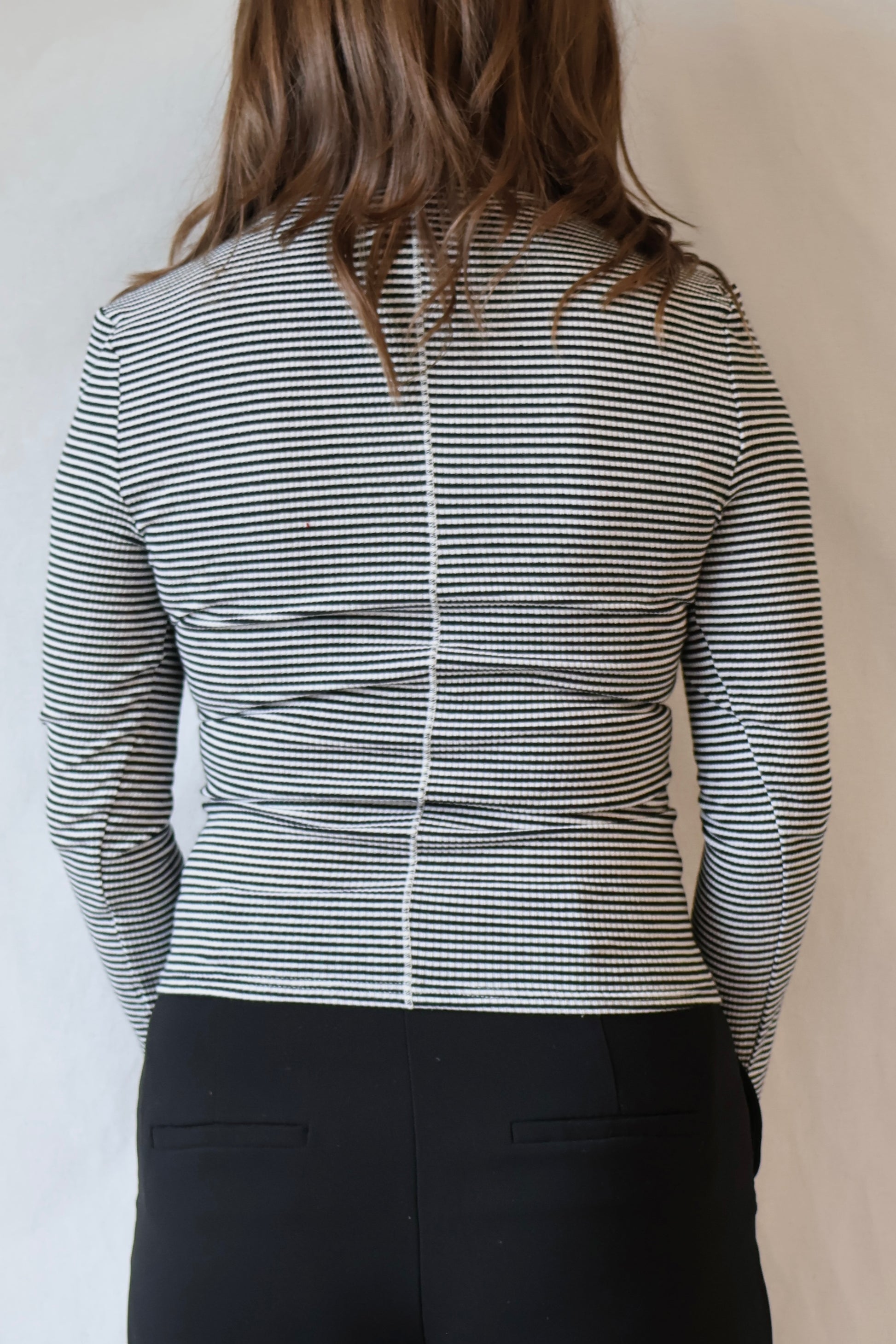 This is a key piece to add to your basics wardrobe range. Made in organic cotton the silhouette is a flattering close fit with length finishing at the hip. Features include a crew neck and long fitted sleeves. This can be tucked in or worn over midrise bottoms.