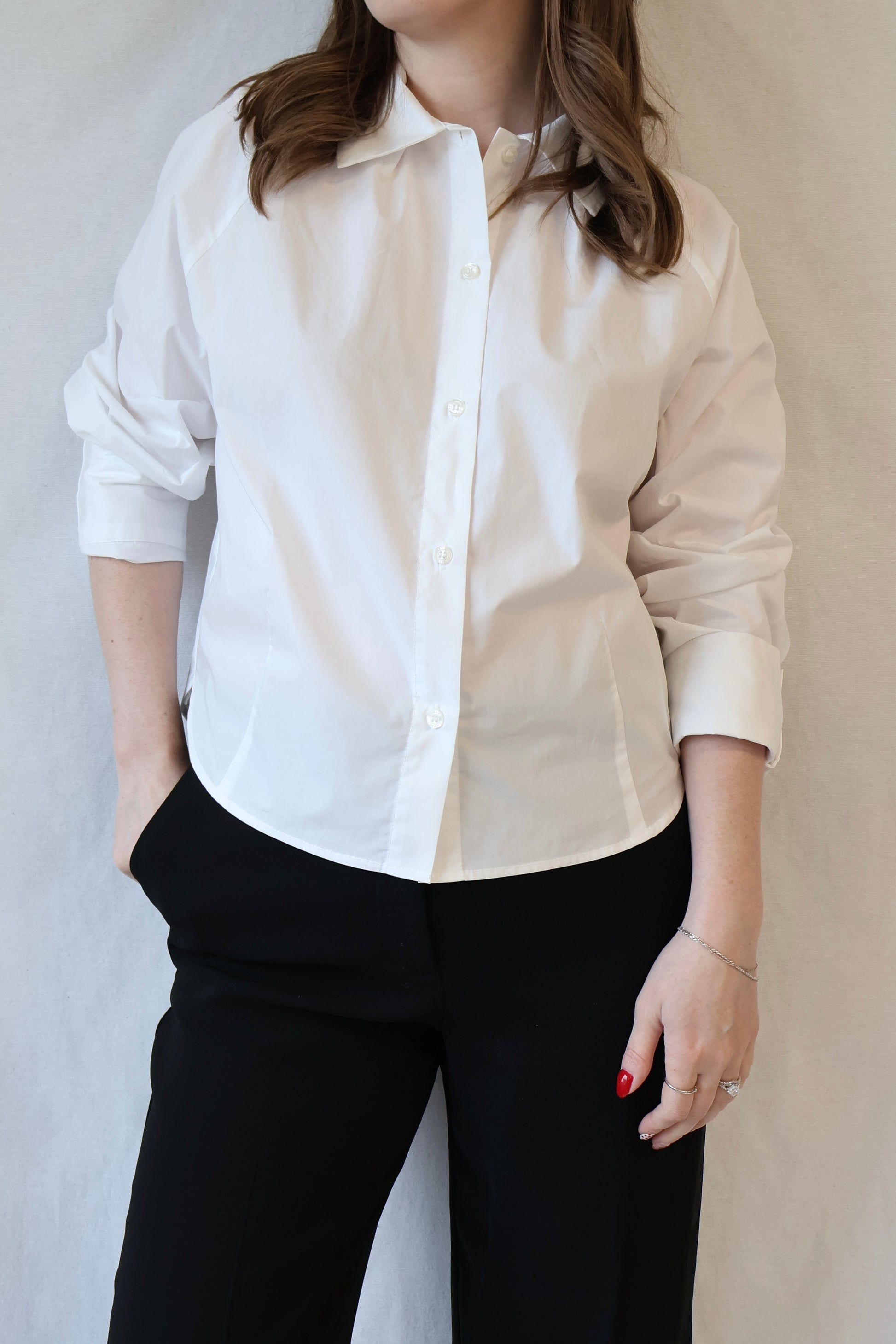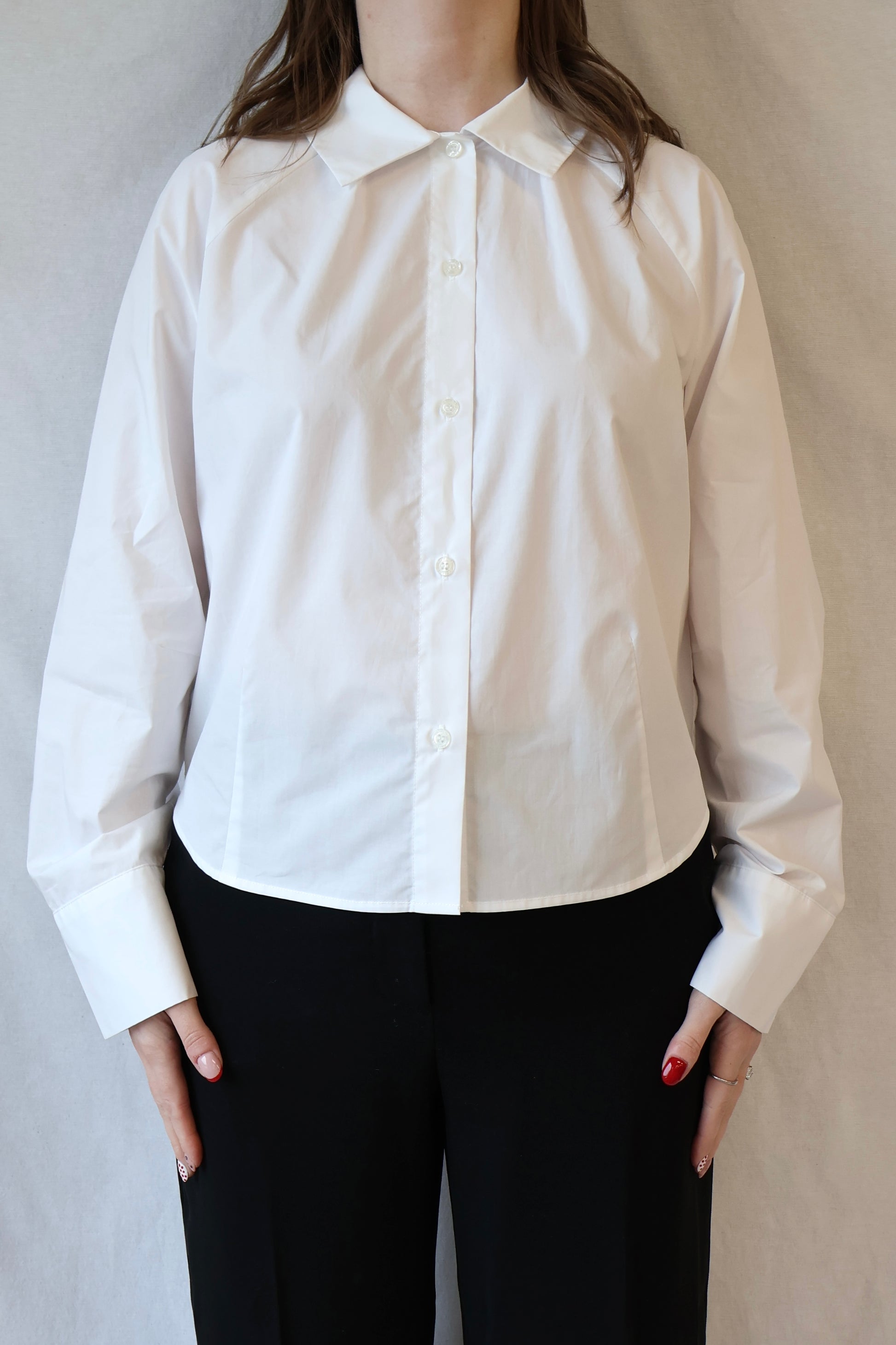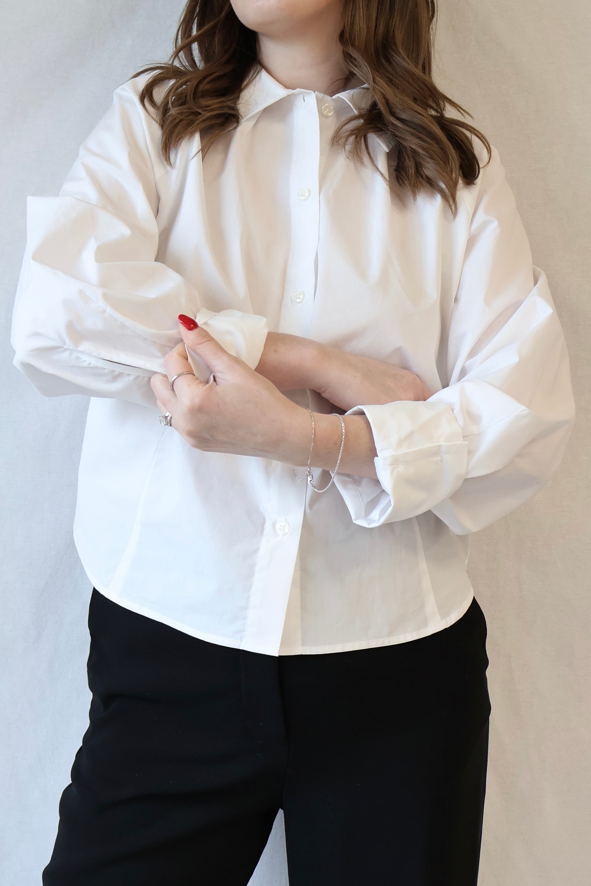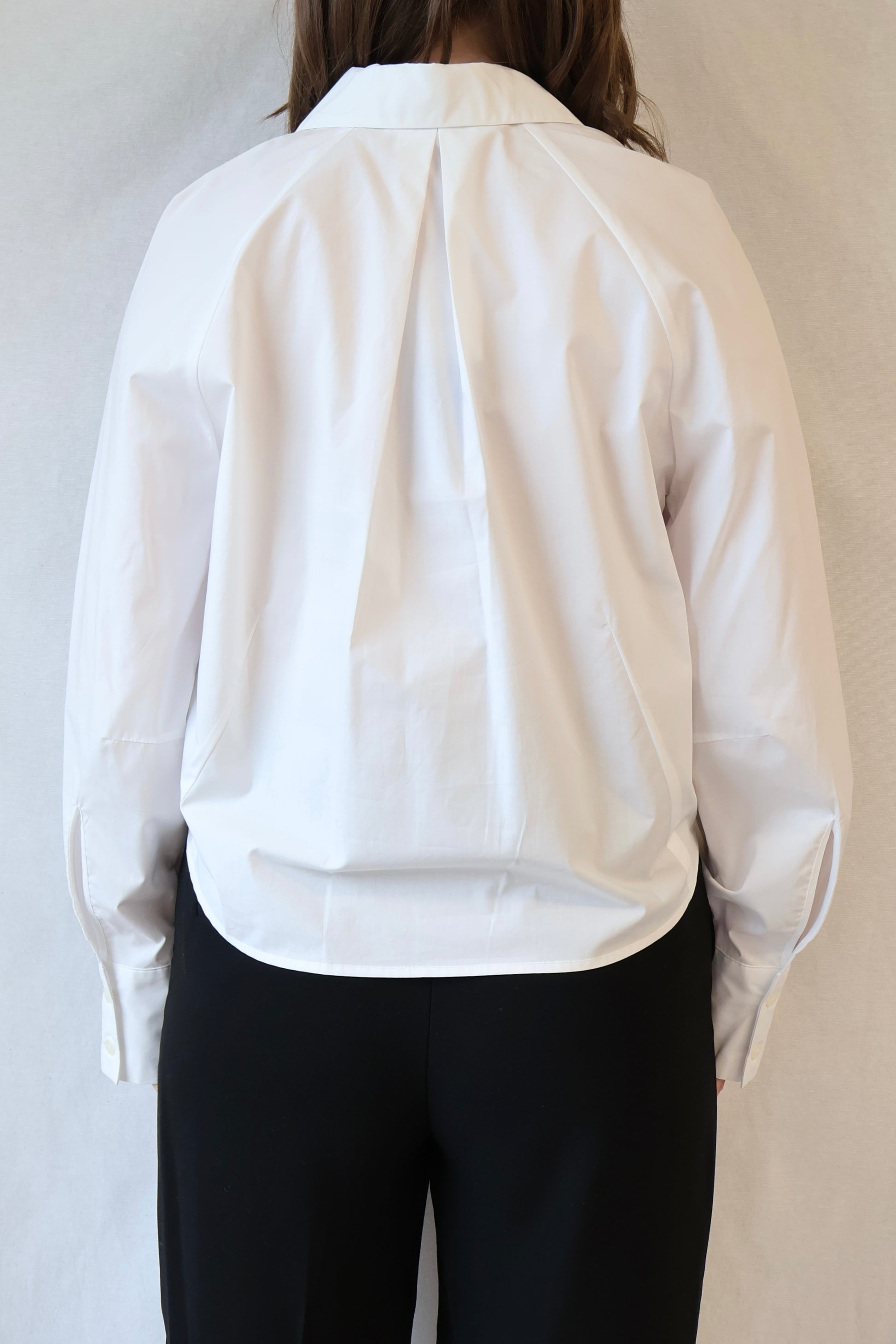 Long-sleeved shirt with a loose fit and curved sleeves. Button closure on the front and buttoned cuffs. Rounded hem. Draped detailing below the collar. Neck yoke seam. Main material made from 100% organic cotton. This product is GOTS certified. Each stage of the supply chain has met strict social, environmental, and chemical requirements.