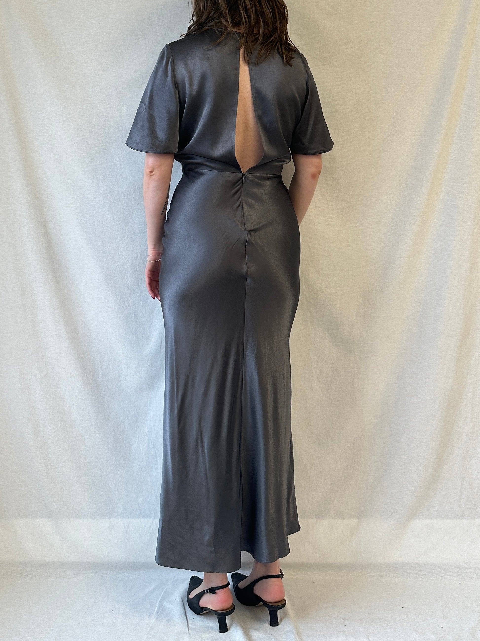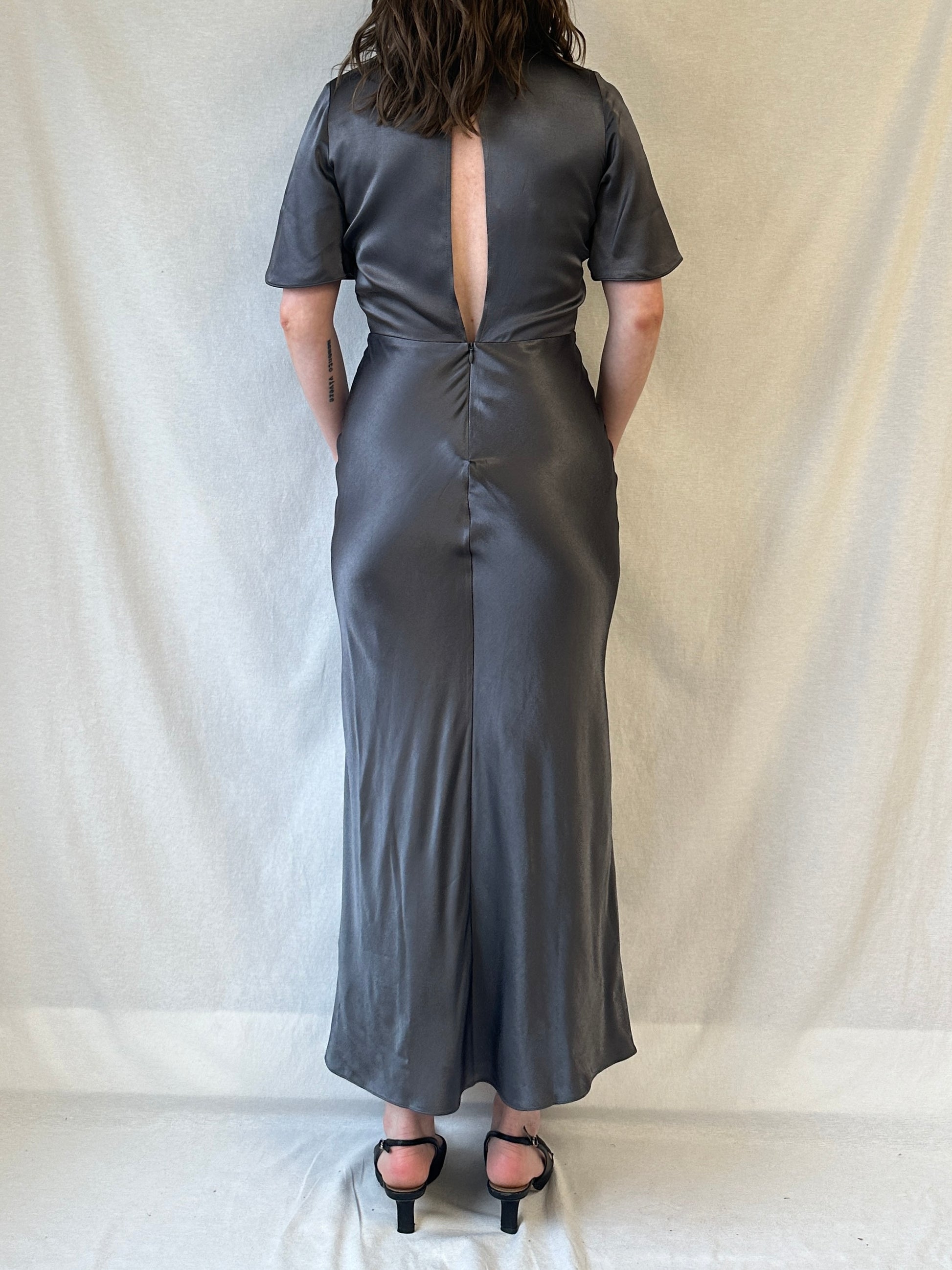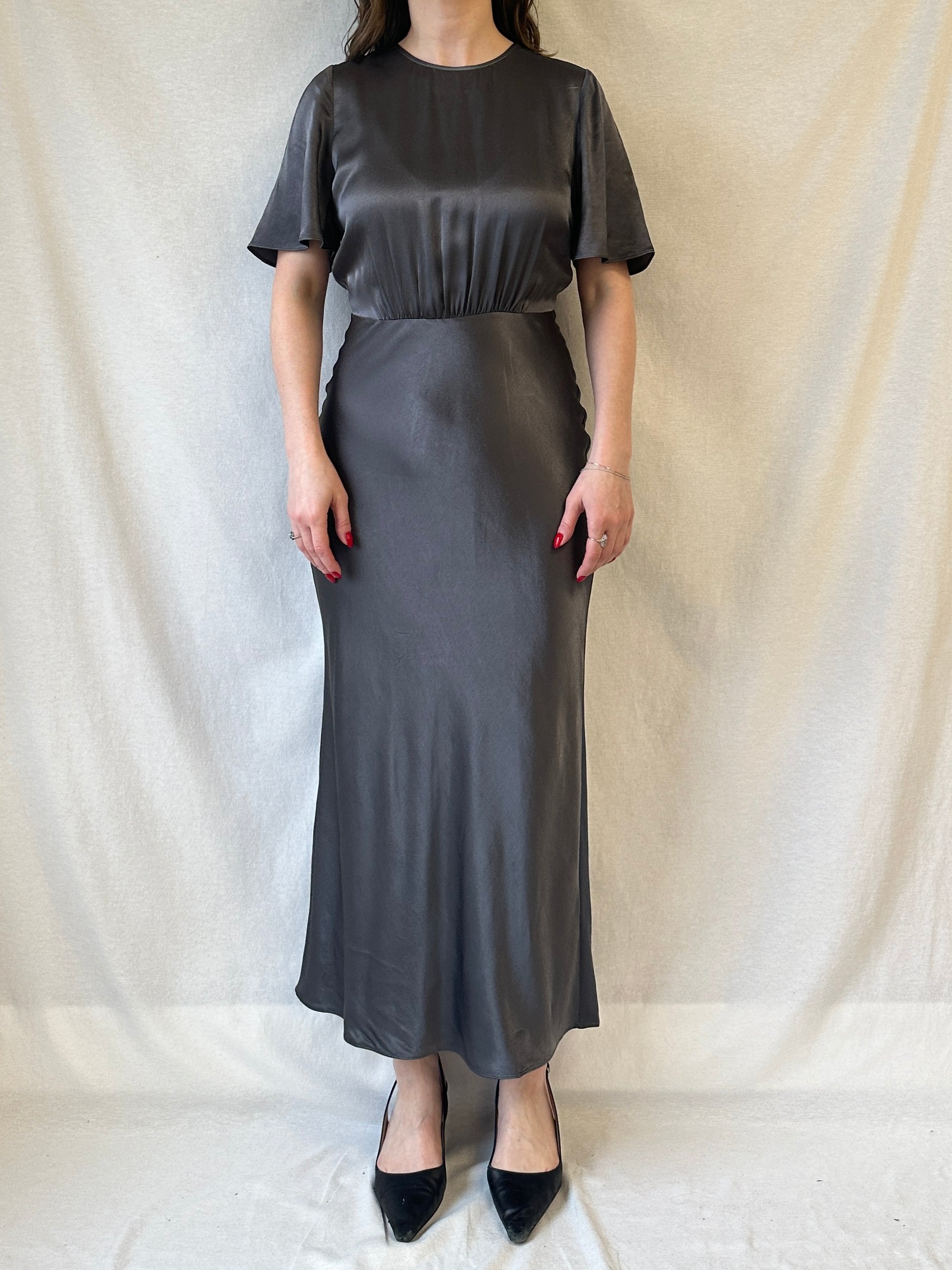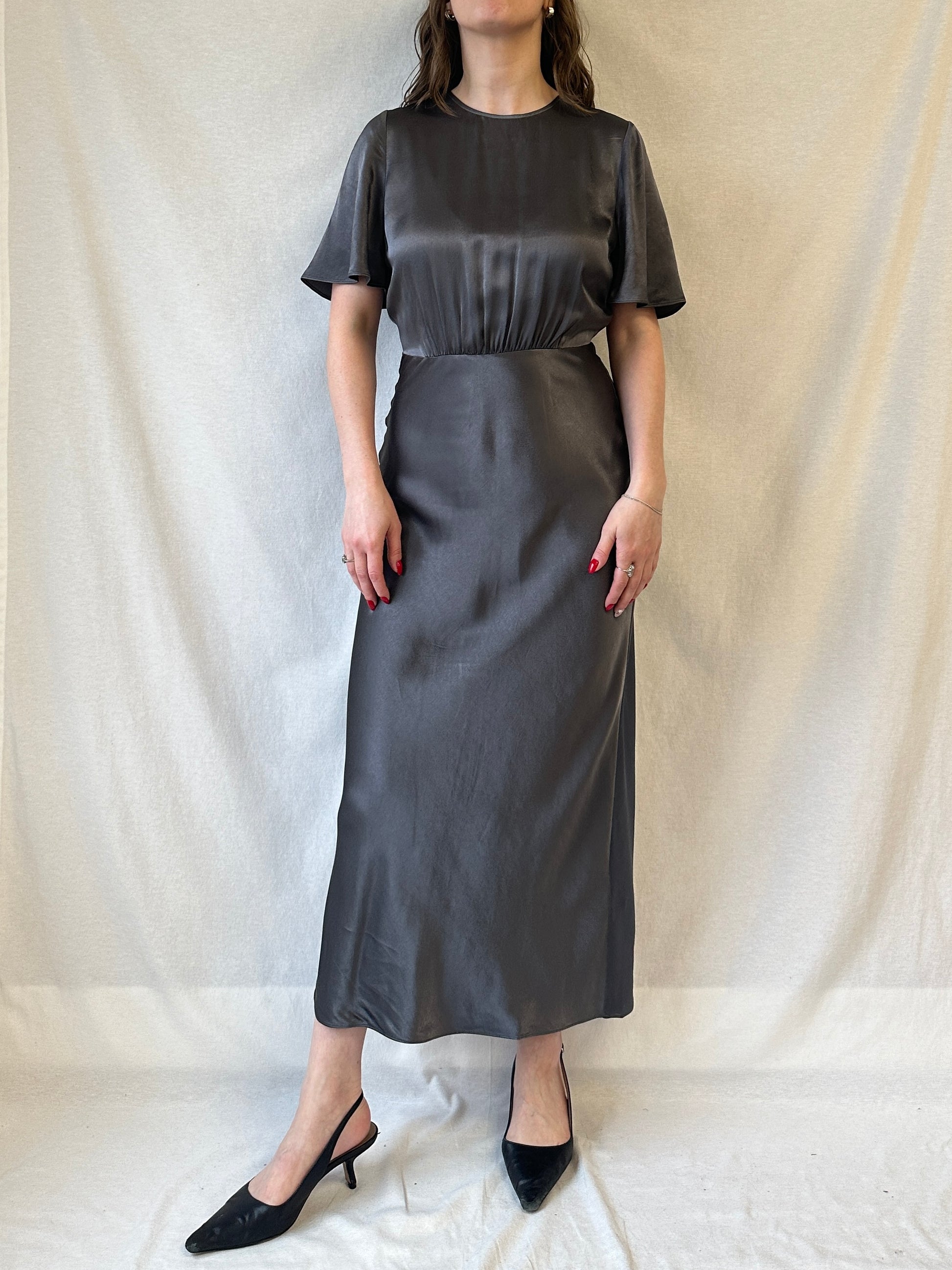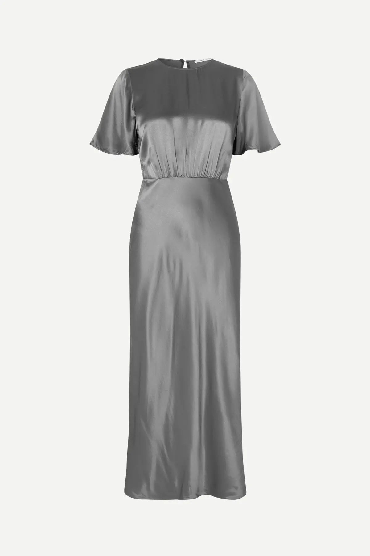 Short-sleeved satin maxi dress with a regular fit and fitted waist. Button and loop as well as invisible zipper closure on the back. Round neck and slit at the back. Main material made from a blend with LENZING™ ECOVERO™ Viscose. This product contains LENZING™ ECOVERO™ Viscose, certified with the EU Ecolabel for textile products for environmental excellence.