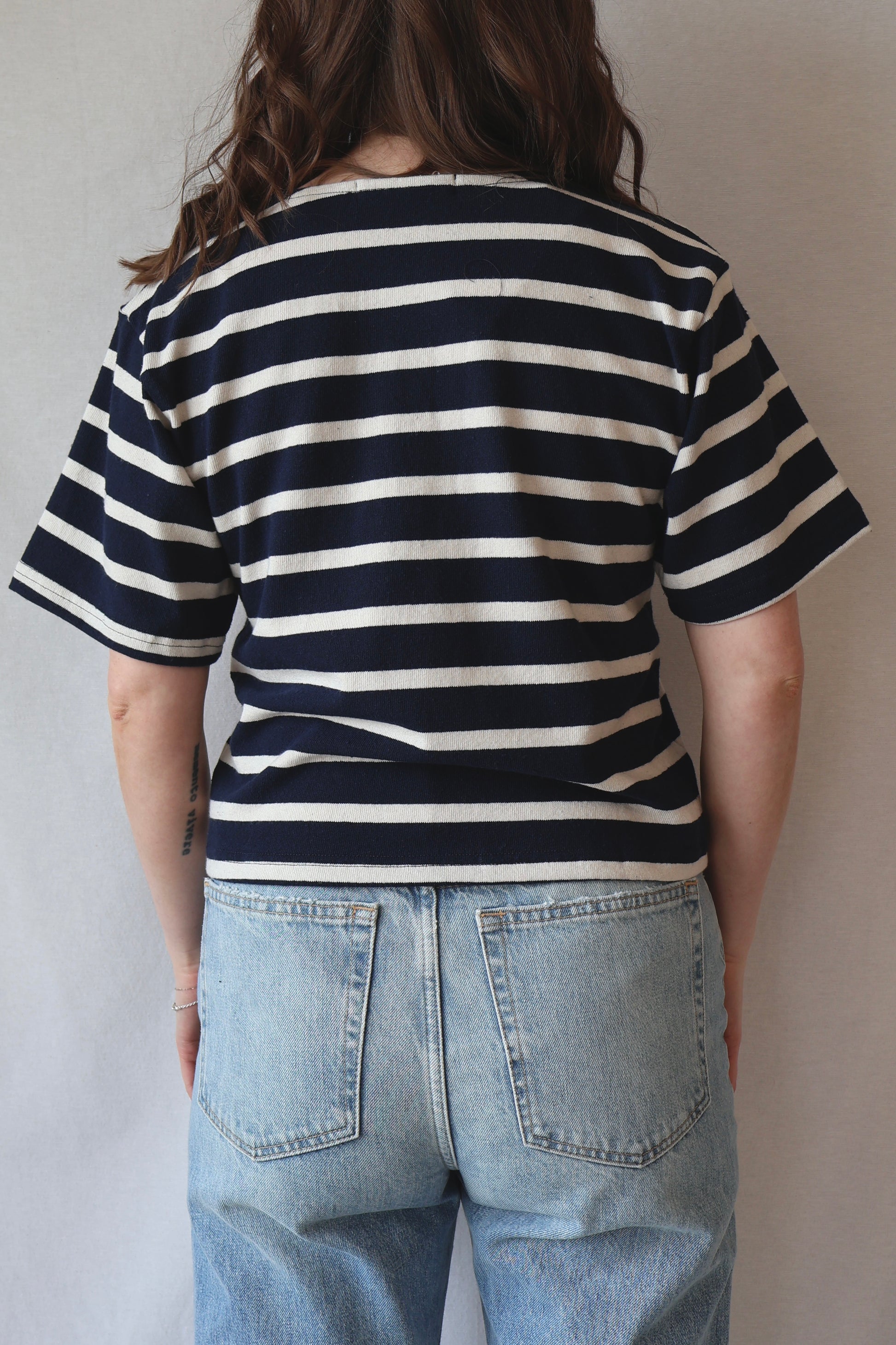 fit: boxy silhouette, slightly cropped with a split neckline.