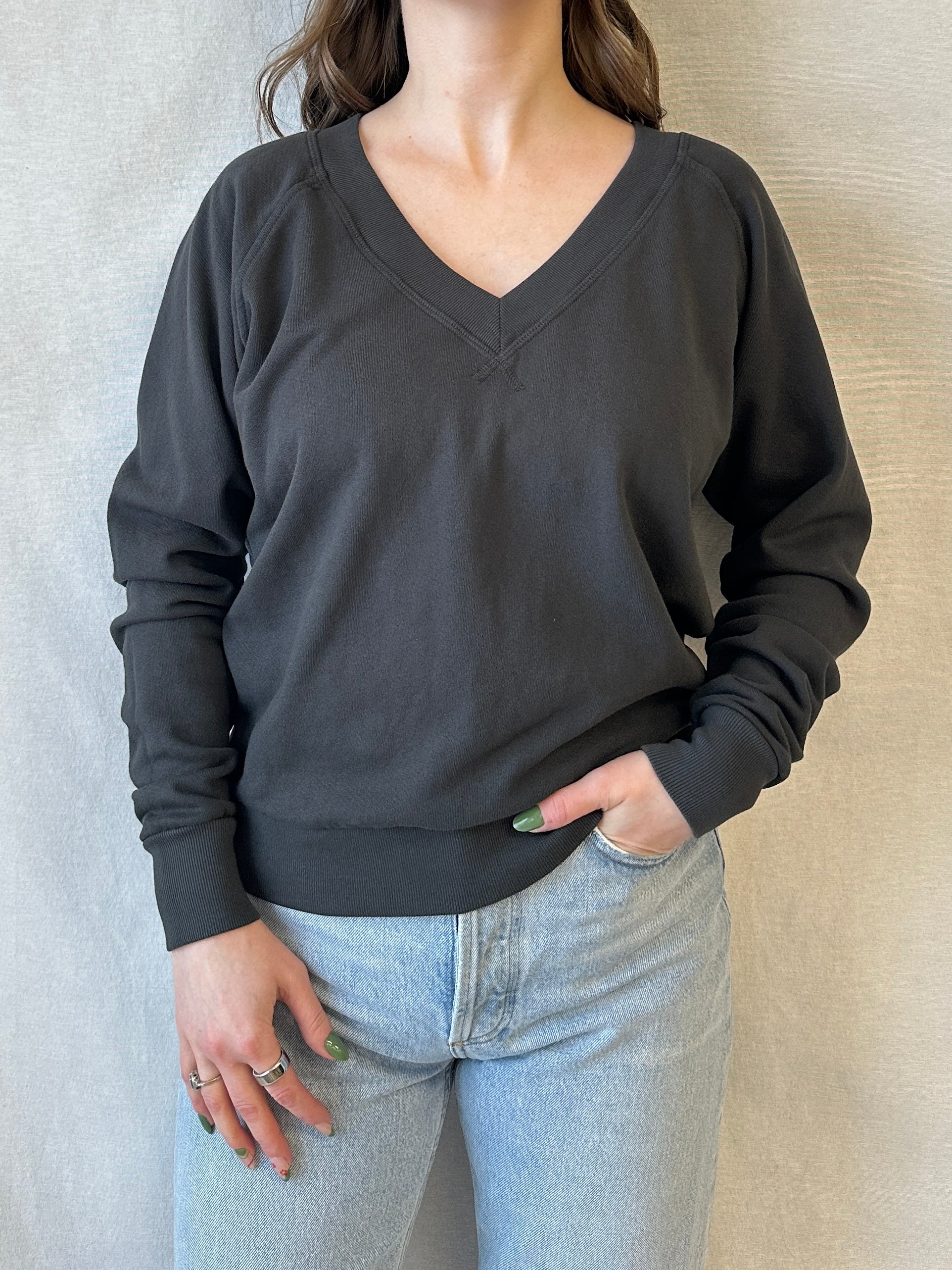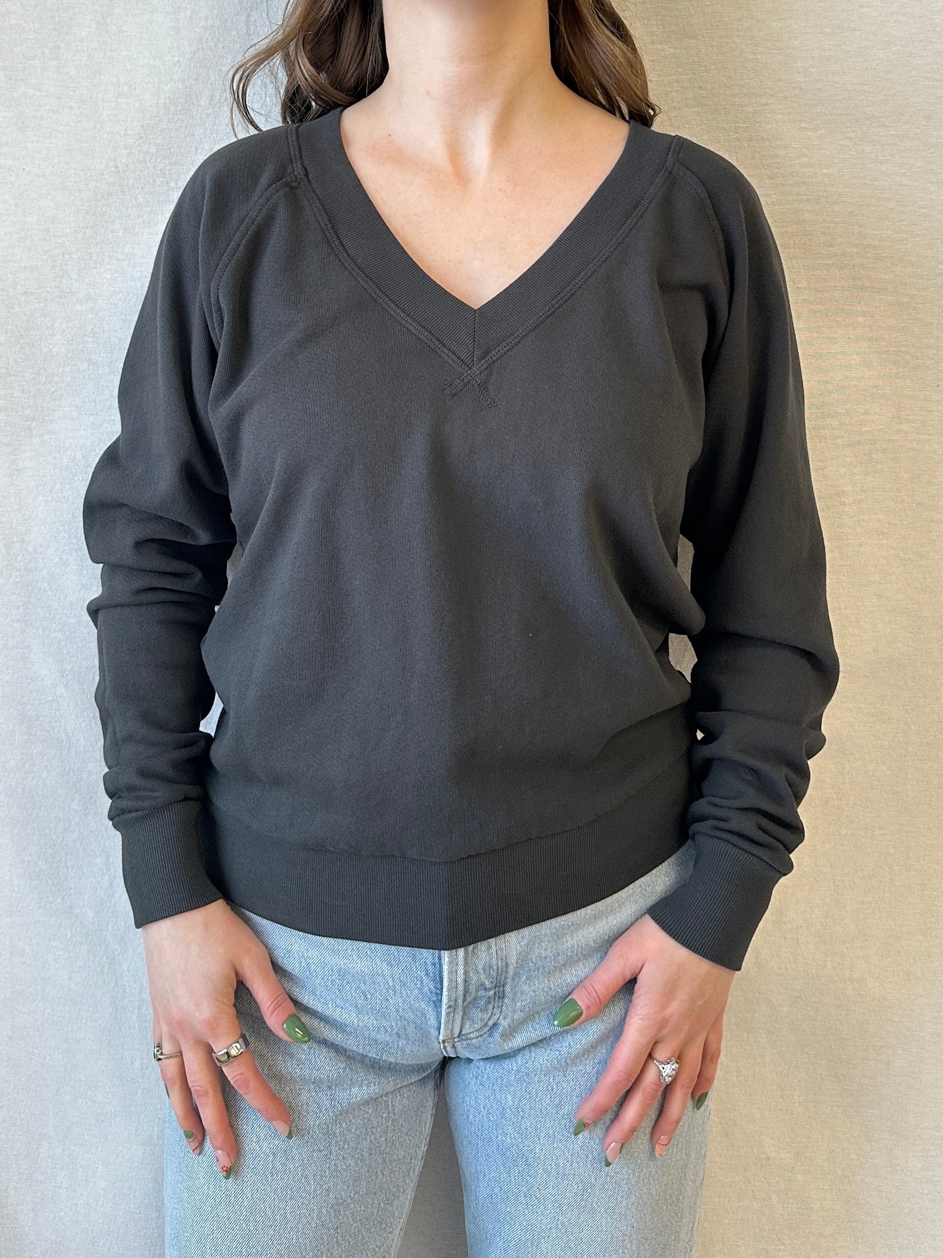 this favorite has a deep v neck with vintage stitching and an oversized fit to keep you cozy all day long. throw this on with denim for a perfect everyday look.