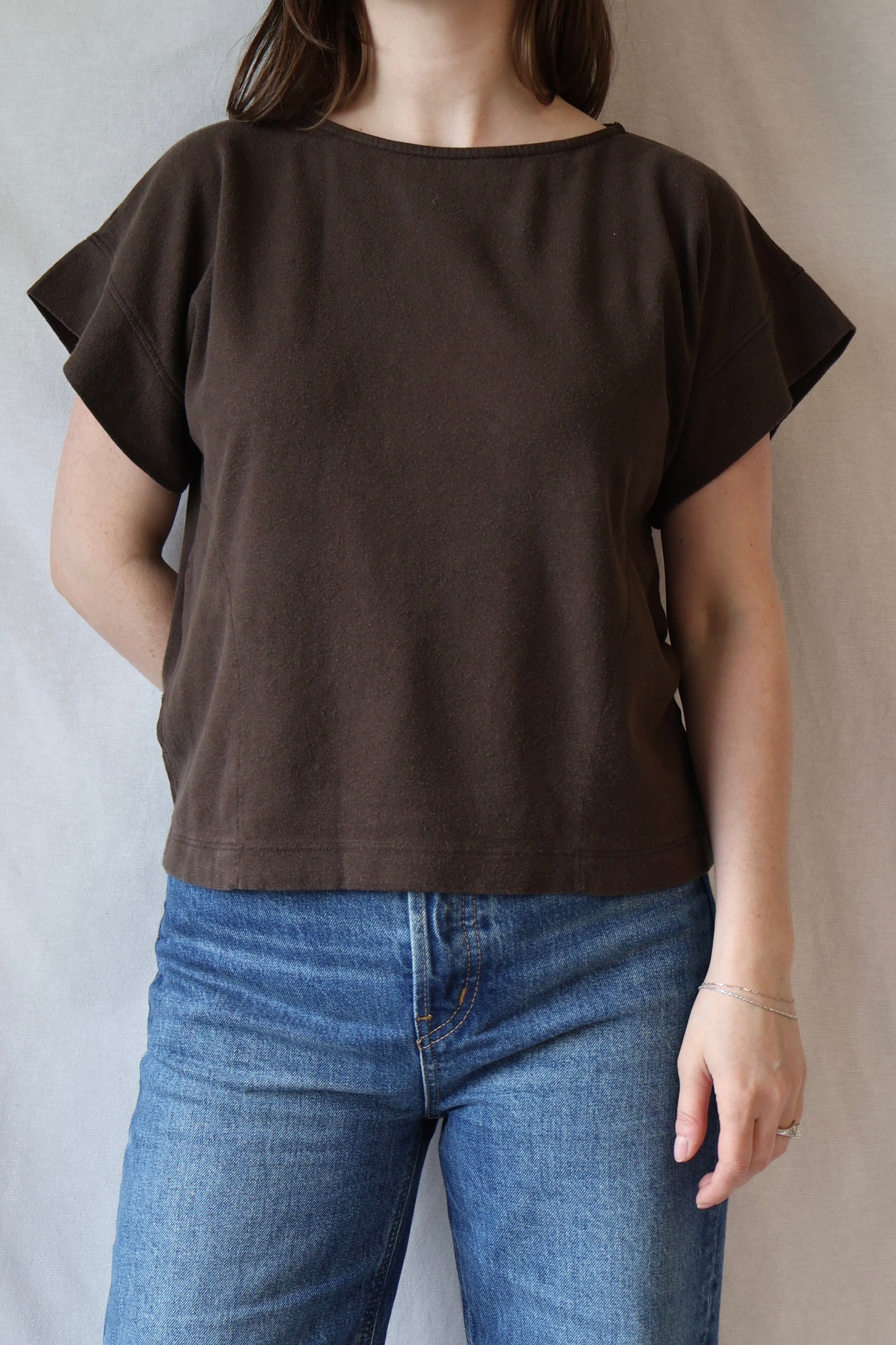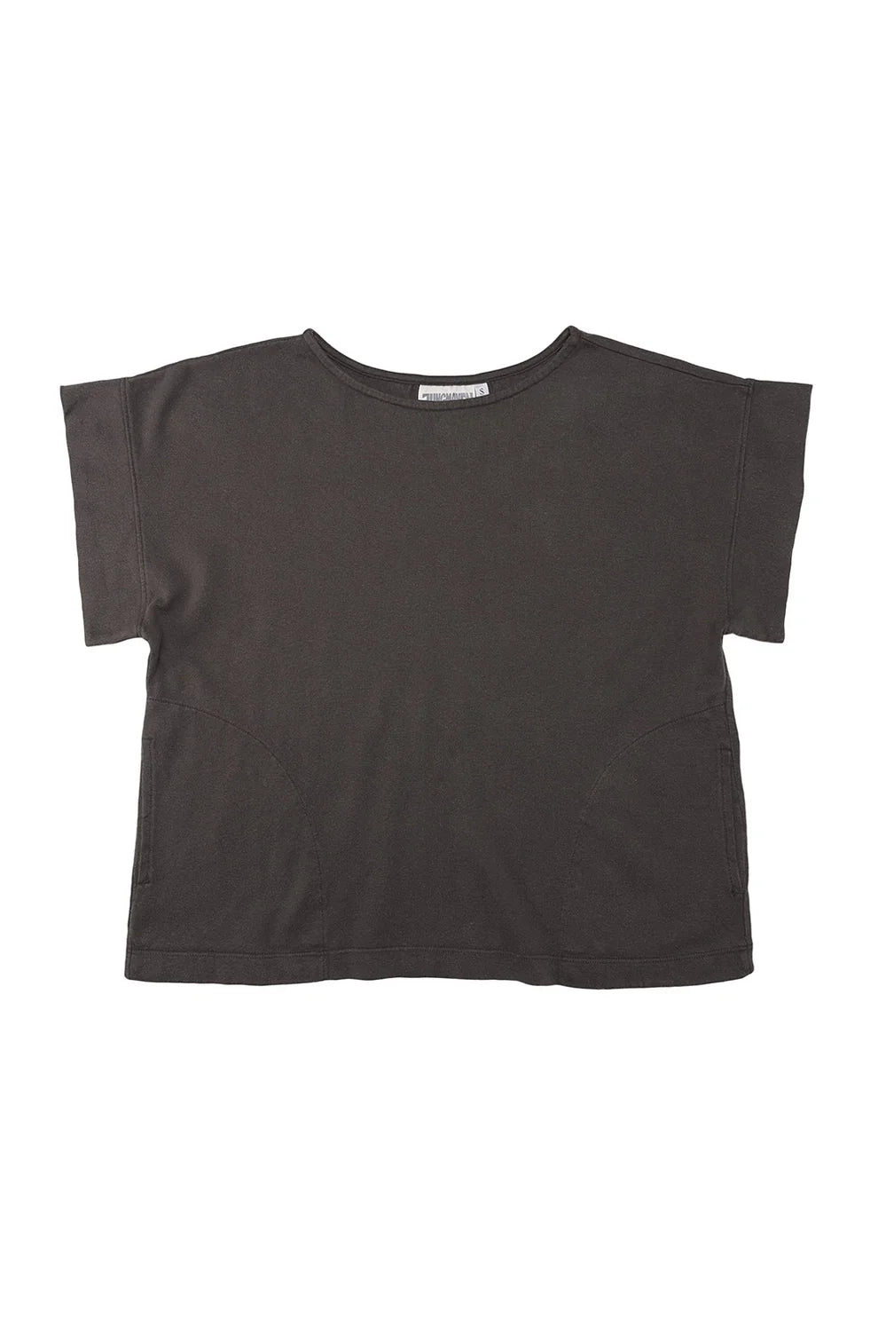 - Boxy/generous fit, subtle boat scooped neck, short sleeve tee