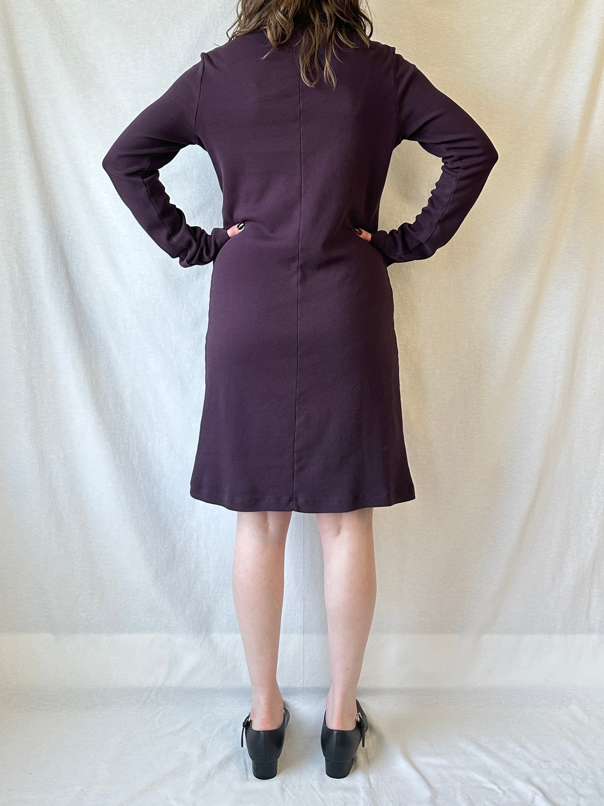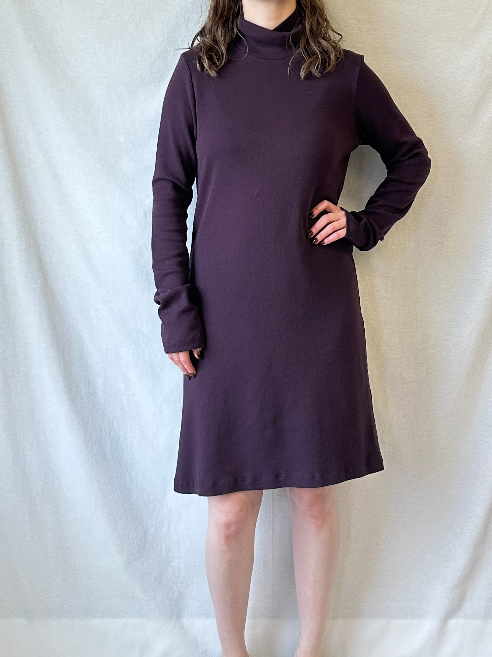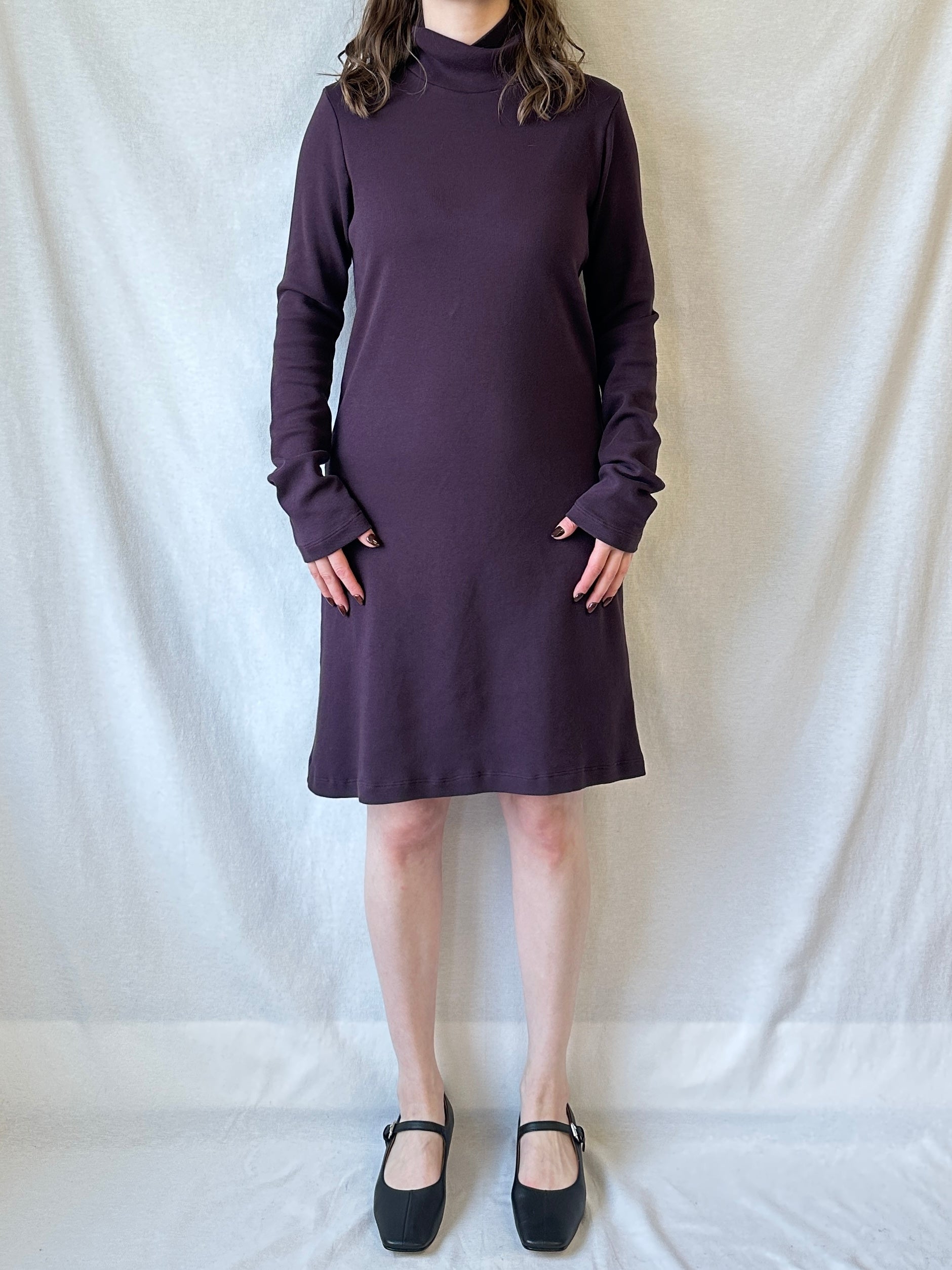 Composed of a thicker, softer, interlock knit (think baby clothes), this high mockneck dress is a loose-fitting basic that you will turn to again and again. A comforting and understated layer that recedes into the background, allowing your identity to come through.