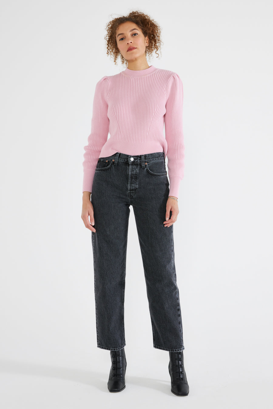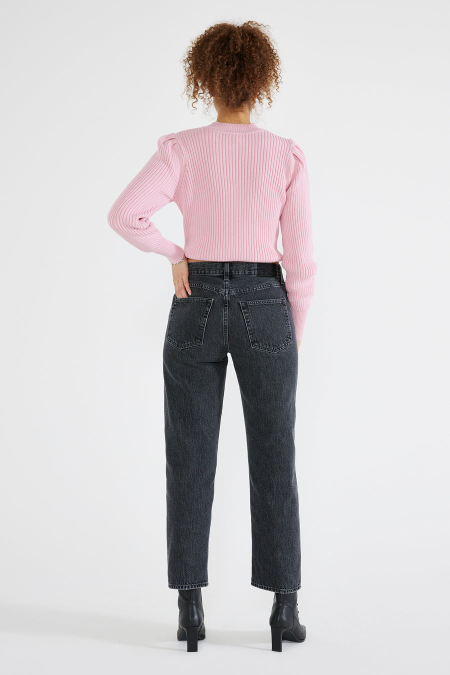 A clean washed-down black straight leg jean with a button fly and vintage construction.